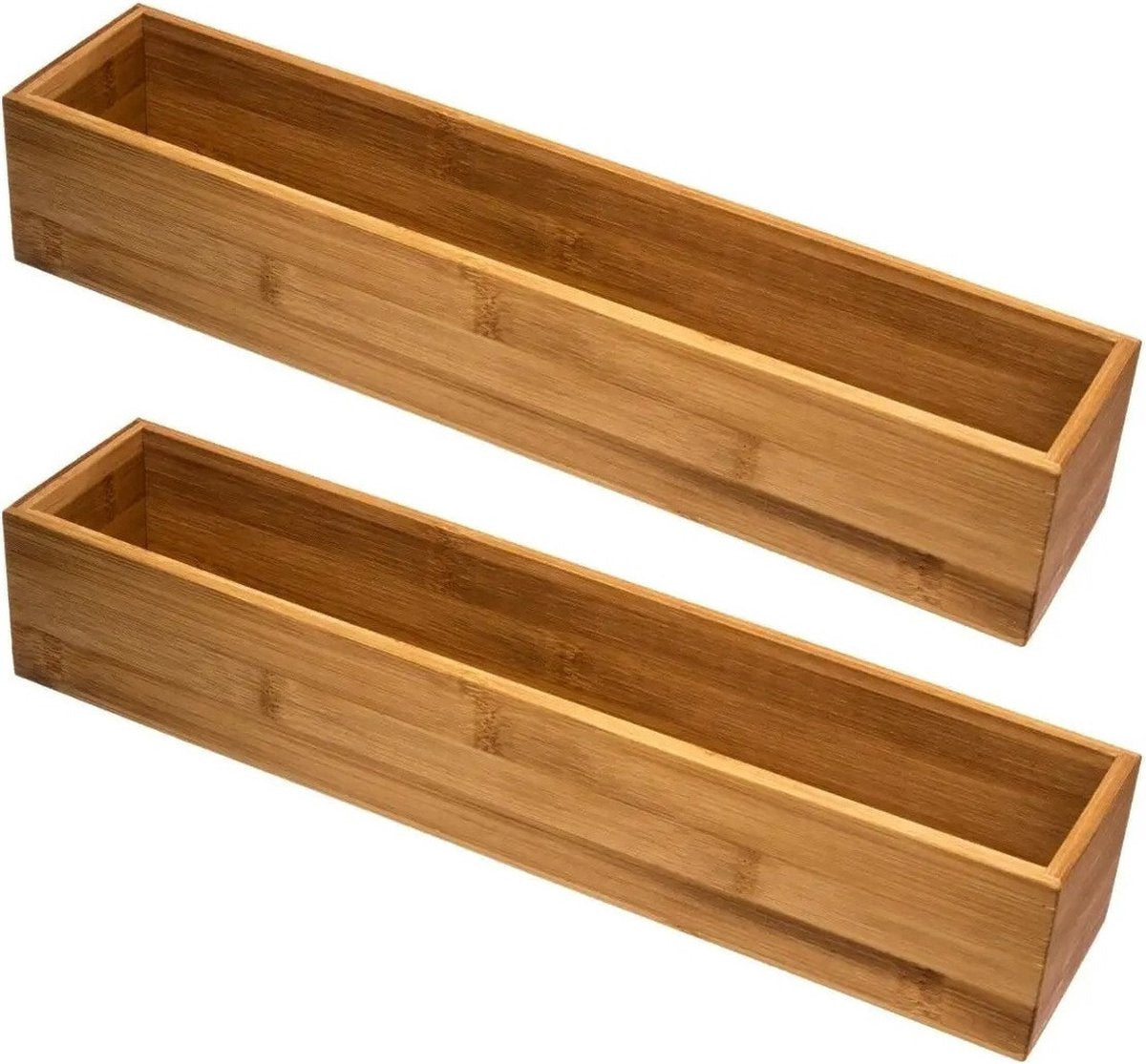2 stuks bestekbak/keuken organizer Tidy Smart. Deze bestekbak kan dienen voor het scheiden van lepels, messen, vorken en ander keukengerei of als fruitmand. Tevens is die ook uitermate handig als opberger voor bijv. in de badkamer. Deze organizer heeft een natuurlijke uitstraling. Haal het maximale uit een opbergruimte door de Tidy Smart bamboe opbergers gemakkelijk te combineren met andere Tidy Smart bamboe varianten van verschillende formaten. Afmeting: ca. 38 x 8 x 7 cm. Materiaal: bamboe.