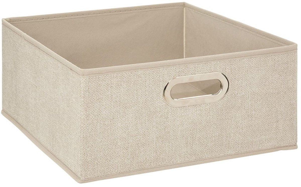 Opbergmand/kastmand in de kleur beige, gemaakt van linnen met afmetingen van 31 x 15 x 15 cm. De opbergbox heeft een handvat aan de voorkant, voor makkelijk uit de kast pakken/schuiven. De zijwanden zijn verstevigd met 2mm dik karton voor extra stabiliteit en daardoor zijn de manden zeer geschikt voor bijvoorbeeld in een kinderkamer. of een vakkenkast Wanneer u de mand niet nodig heeft kunt u deze makkelijk opvouwen en opbergen. Voor meer formaten van deze manden zoekt u op de term: mixmodul. Afmeting: ca. 31 x 15 x 15 cm. Inhoud: ca. 7 liter. Materiaal: karton/kunststof/linnen.