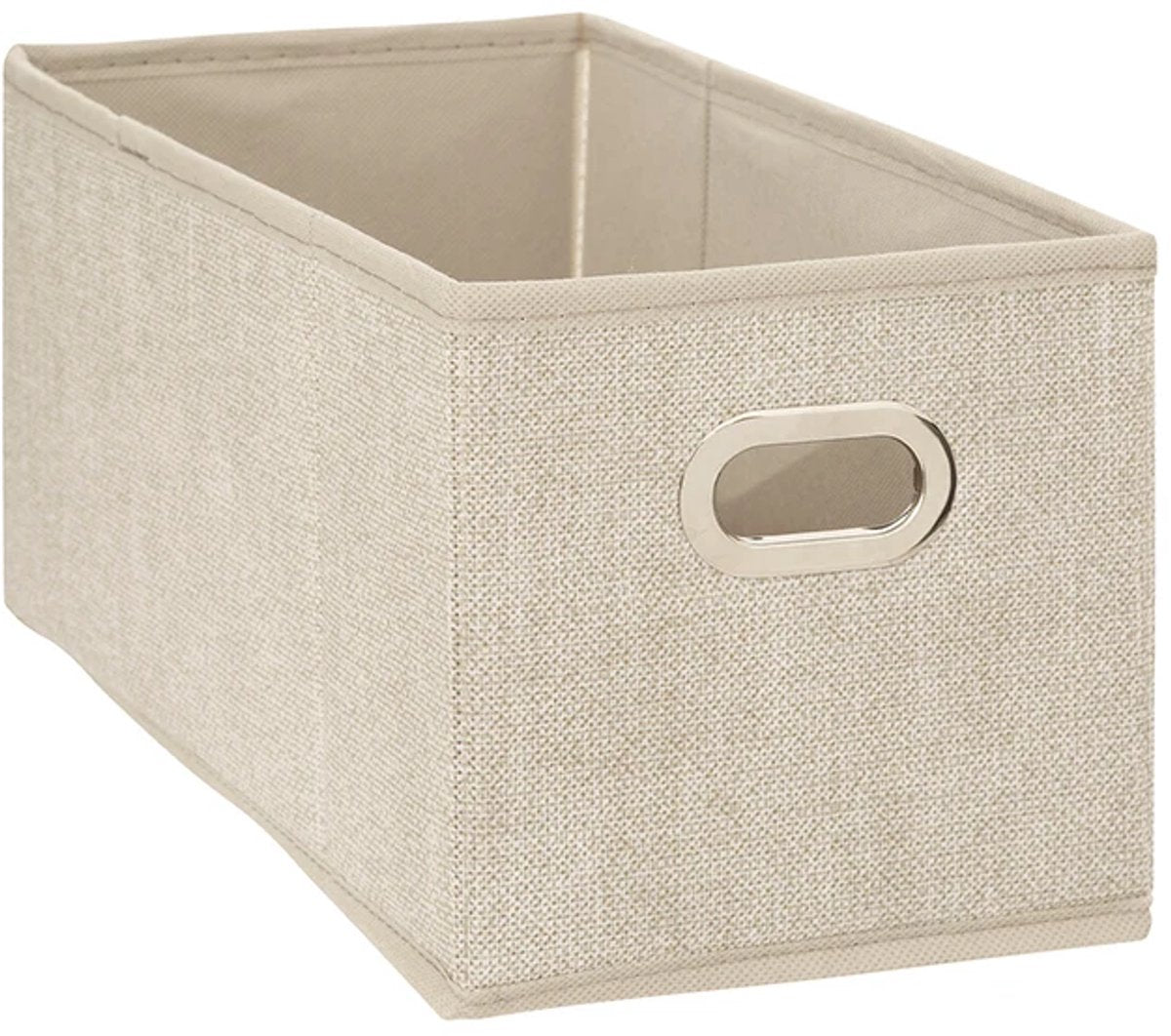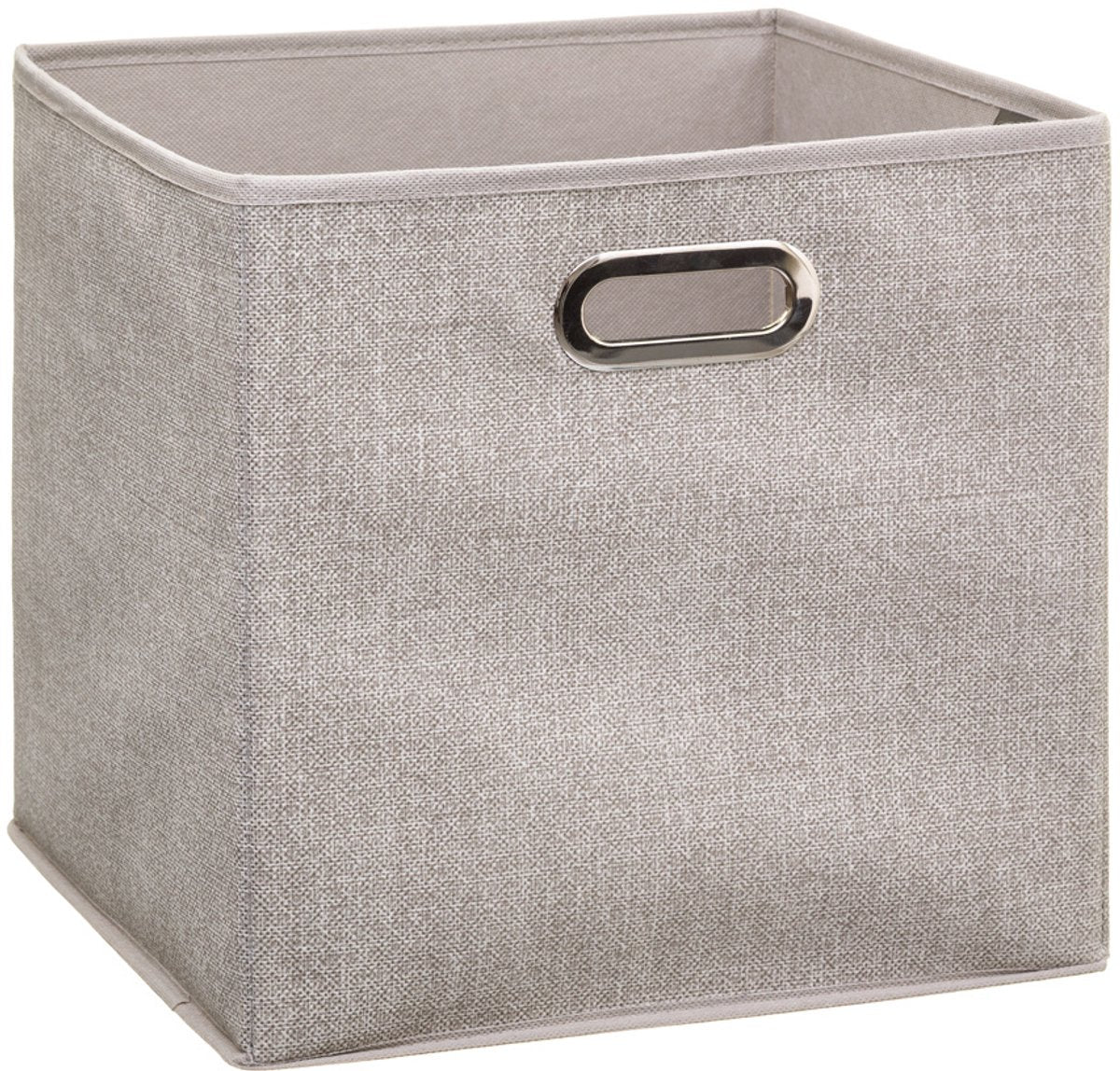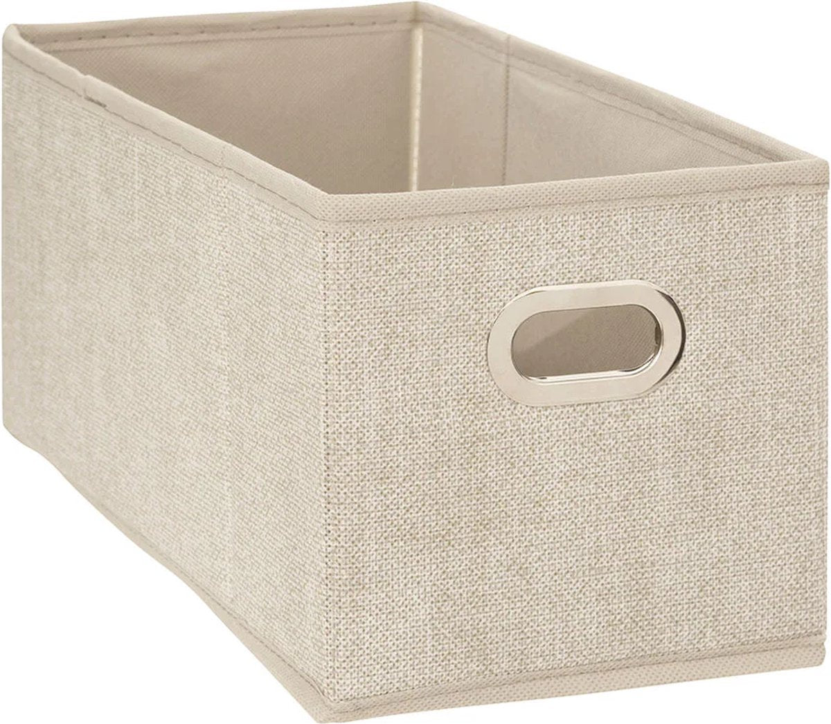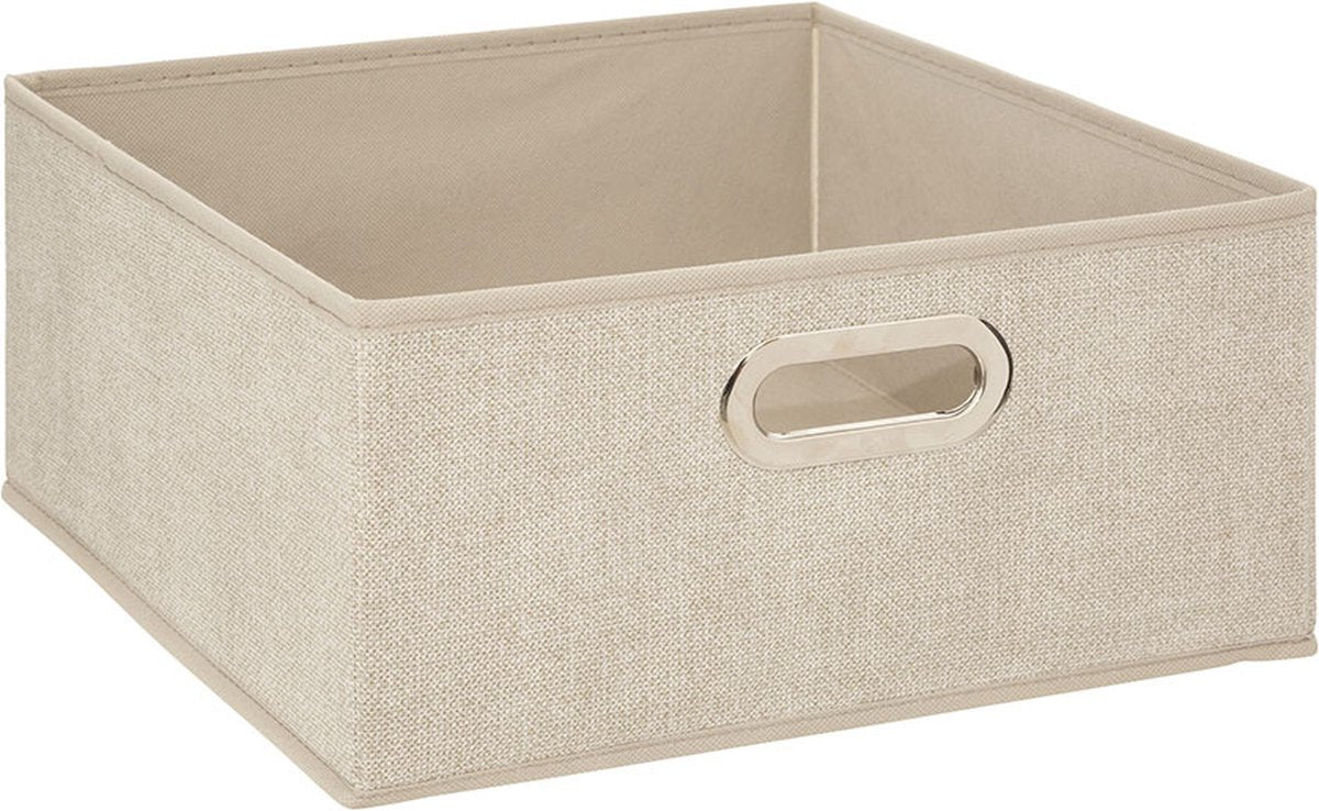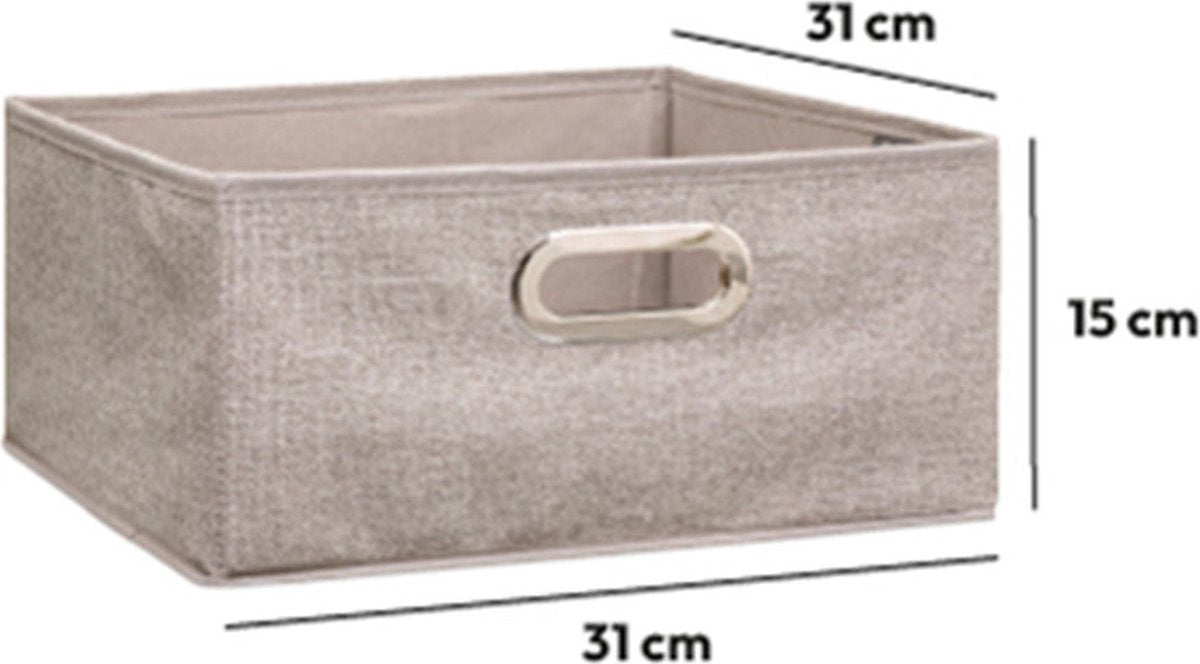Opbergmand/kastmand in de kleur beige, gemaakt van linnen met afmetingen van 31 x 31 x 15 cm. De opbergbox heeft een handvat aan de voorkant, voor makkelijk uit de kast pakken/schuiven. De zijwanden zijn verstevigd met 2mm dik karton voor extra stabiliteit en daardoor zijn de manden zeer geschikt voor bijvoorbeeld in een kinderkamer. of een vakkenkast Wanneer u de mand niet nodig heeft kunt u deze makkelijk opvouwen en opbergen. Voor meer formaten van deze manden zoekt u op de term: mixmodul. Afmeting: ca. 31 x 31 x 15 cm. Inhoud: ca. 14 liter. Materiaal: karton/kunststof/linnen.