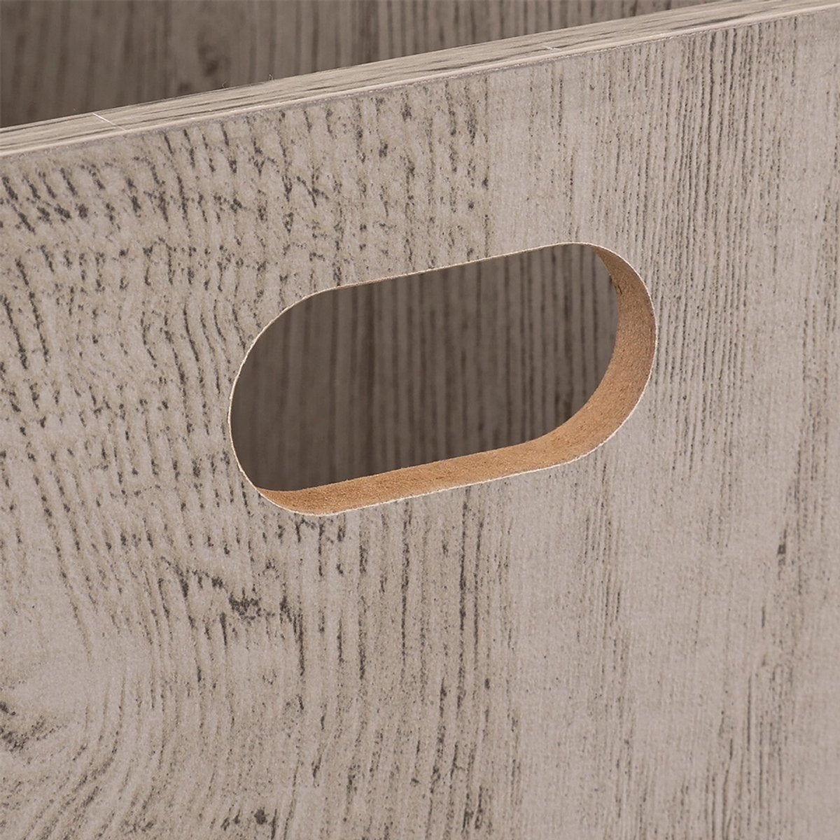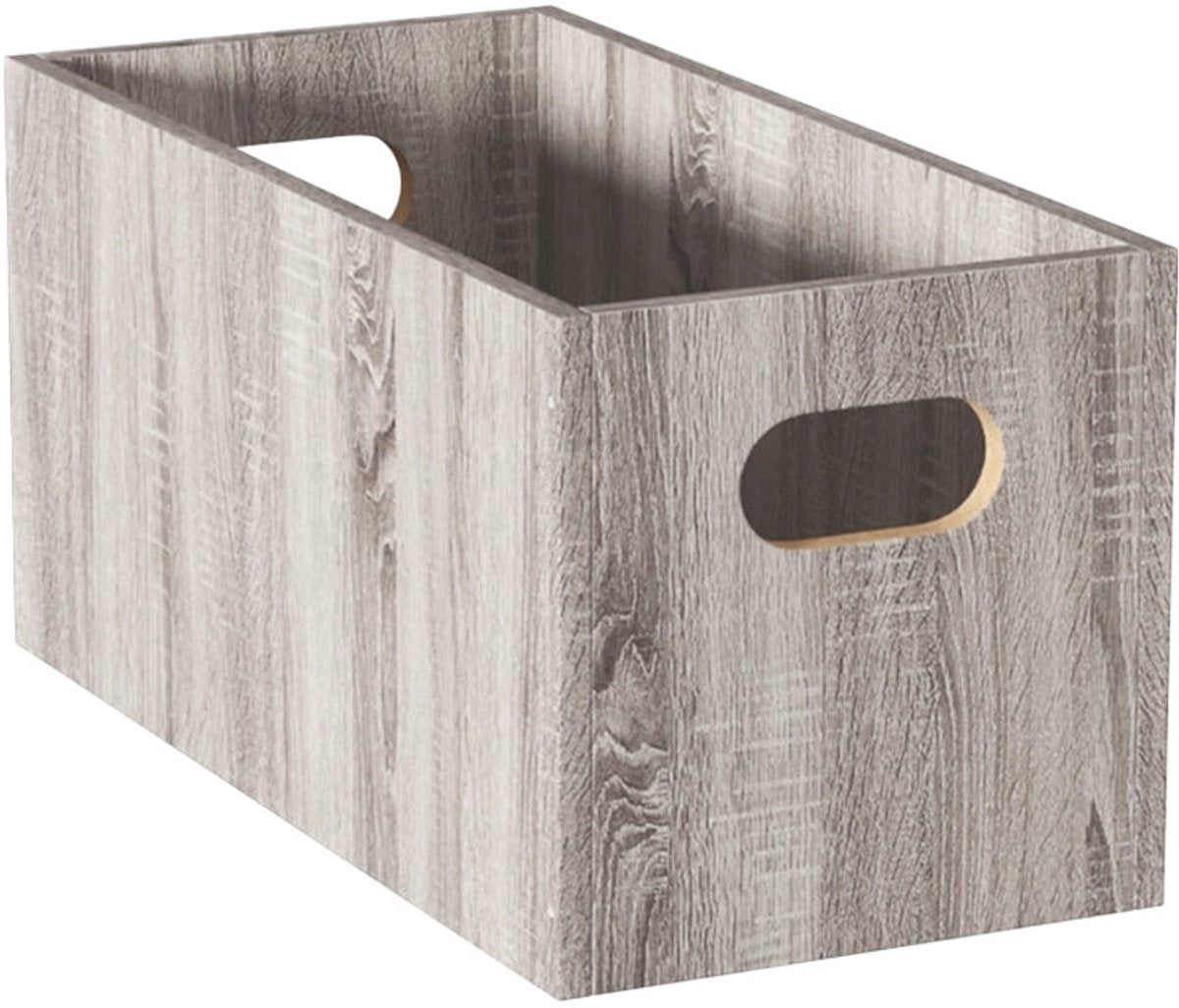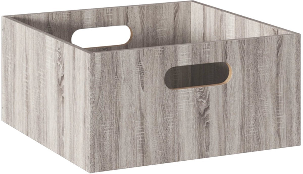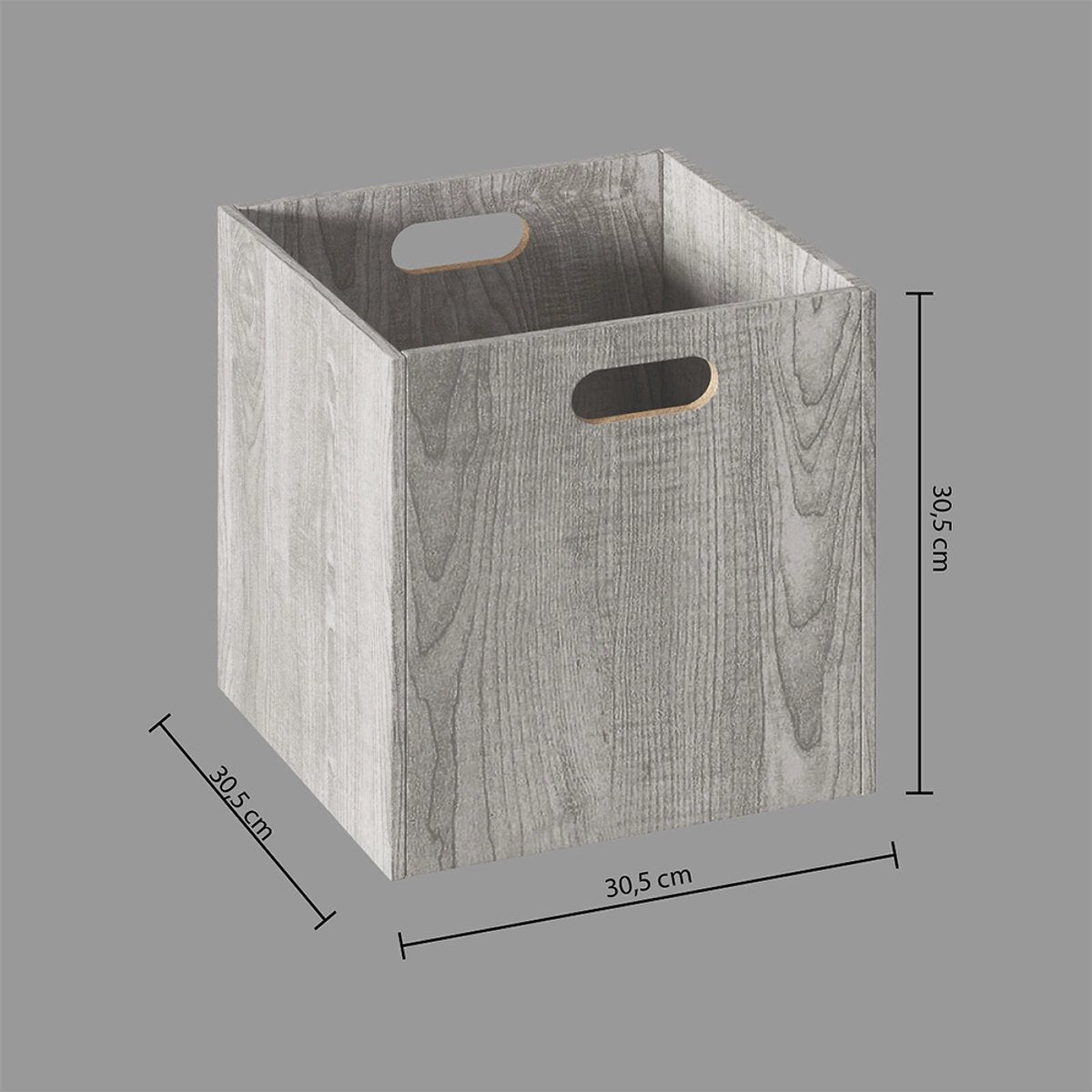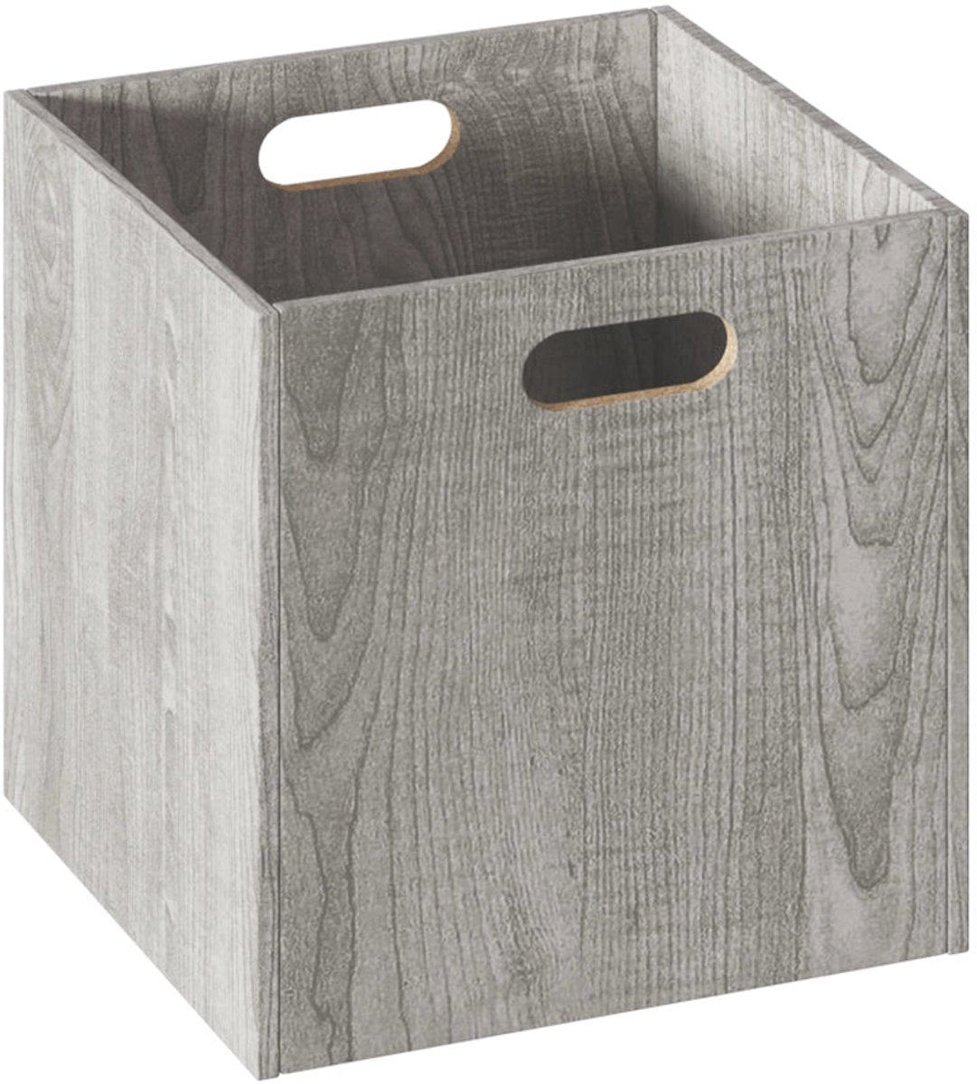 Opbergmand/kastmand in het grijs, gemaakt van hout, met afmetingen van 31 x 31 x 15 cm. De opbergbox heeft een handvat aan de voorkant, voor makkelijk uit de kast pakken/schuiven. De manden zijn zeer geschikt voor bijvoorbeeld in een kinderkamer of een vakkenkast. Wanneer u de mand niet nodig heeft kunt u deze inklappen en opbergen. U dient de mand zelf nog in elkaar te zetten (uit vouwen en vast zetten), schroefjes worden meegeleverd. Voor meer formaten van deze manden zoekt u op de term: mixmodulgrijswood. Afmeting: ca. 31 x 31 x 15 cm. Inhoud: ca. 14 liter. Materiaal: mdf/hout.