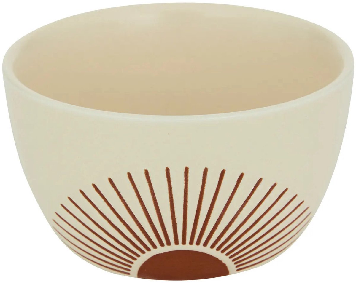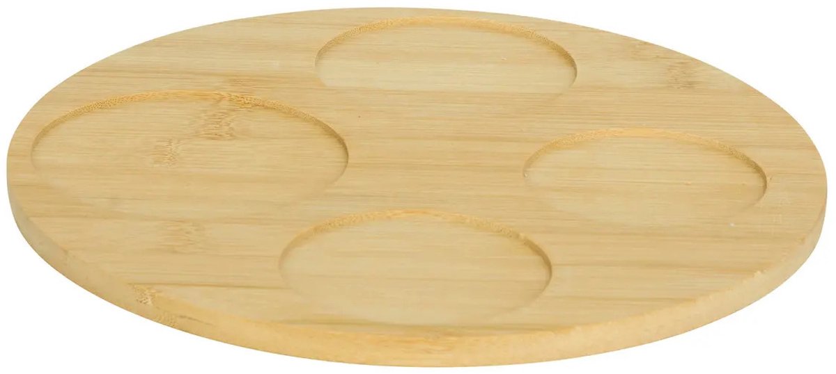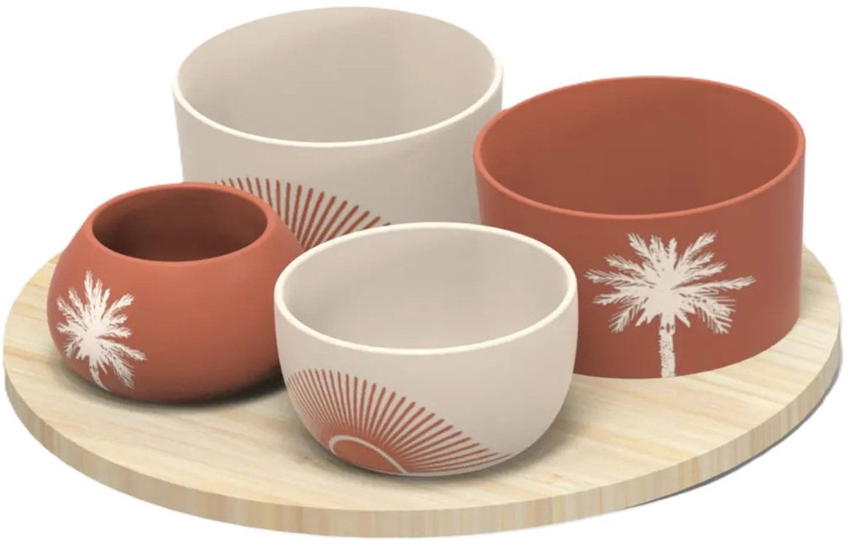 Serveerplank van acacia hout van D26 cm met 4x luxe hapjes / saus / tapas schaaltjes in het terra/wit. De... Lees meer