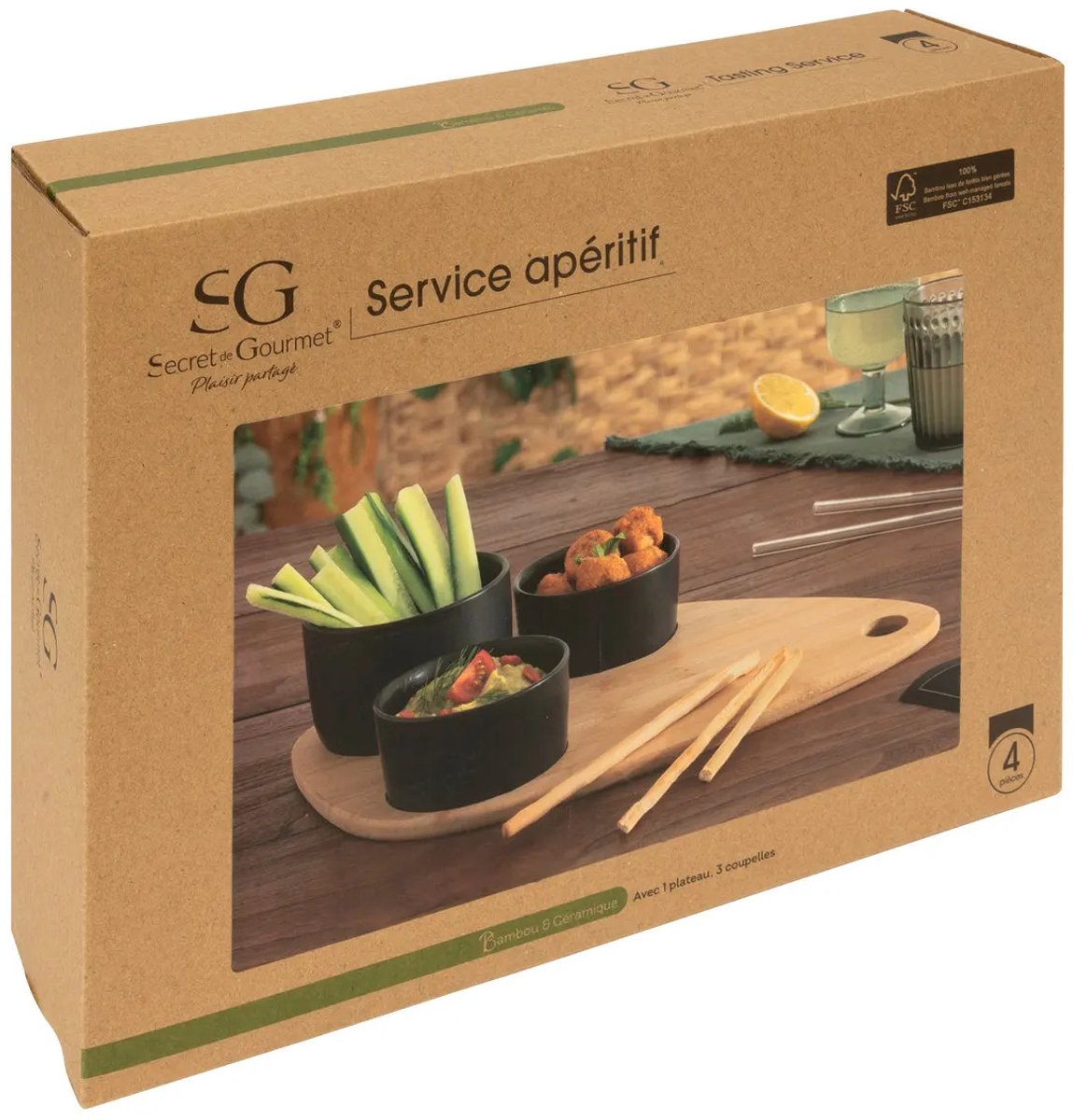 5Five Serveerplank bamboe - met 4x luxe schaaltjes - 35 x 24 cm - tapas en saus schaaltjes - zwart