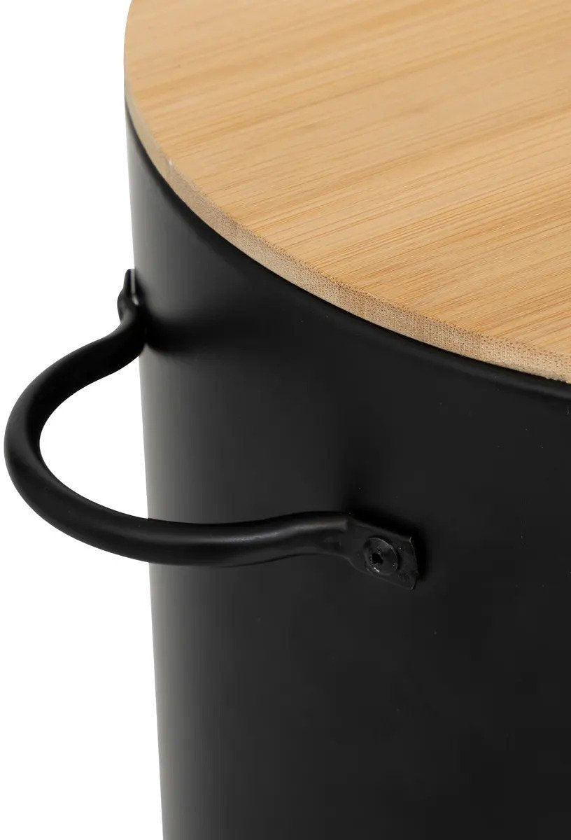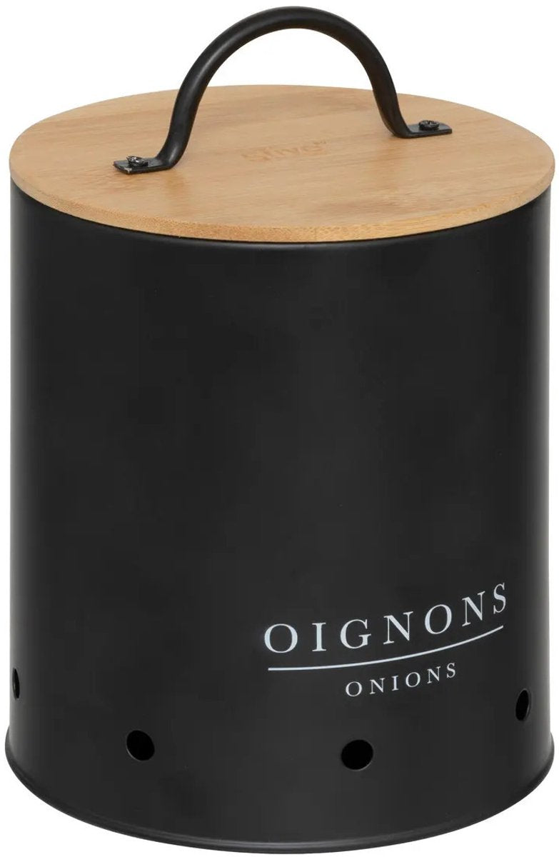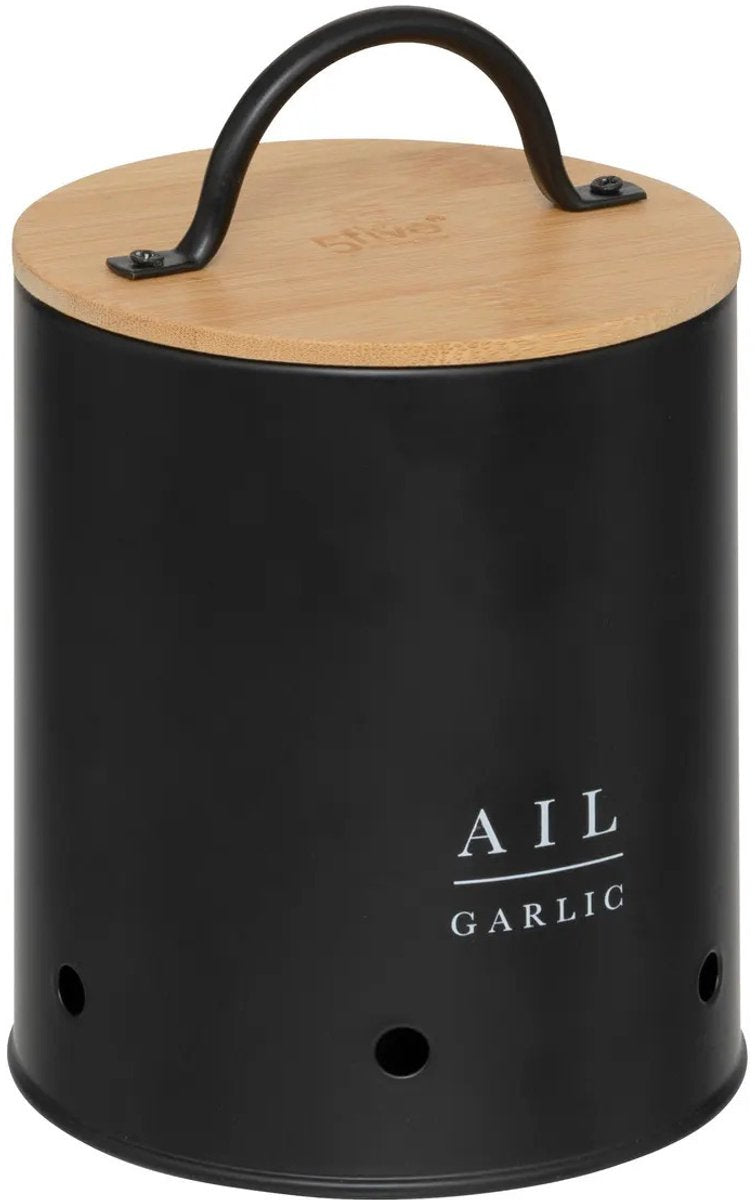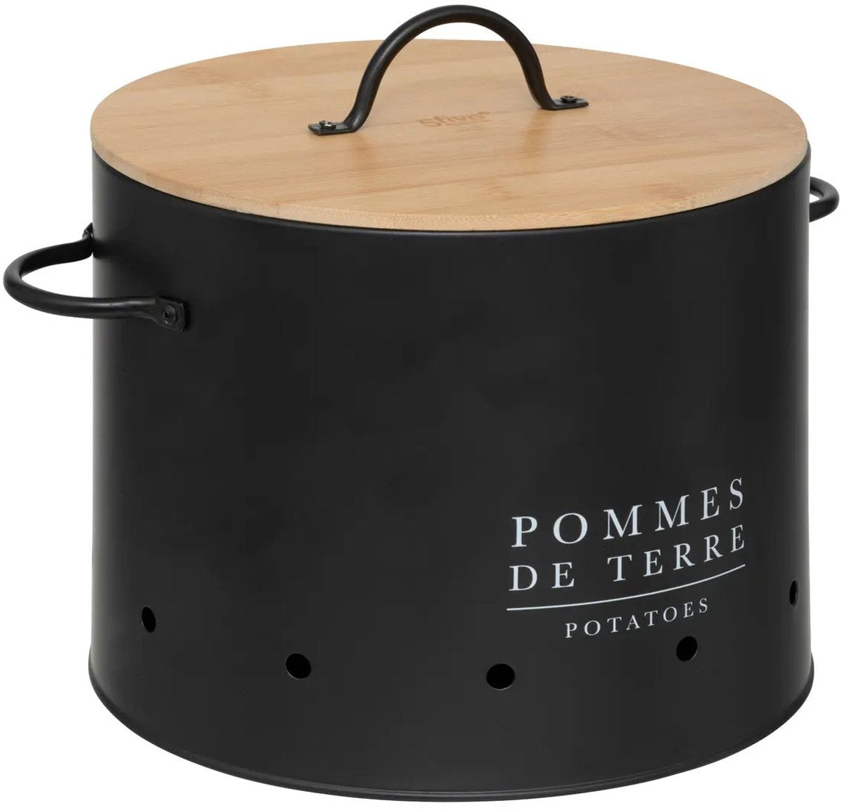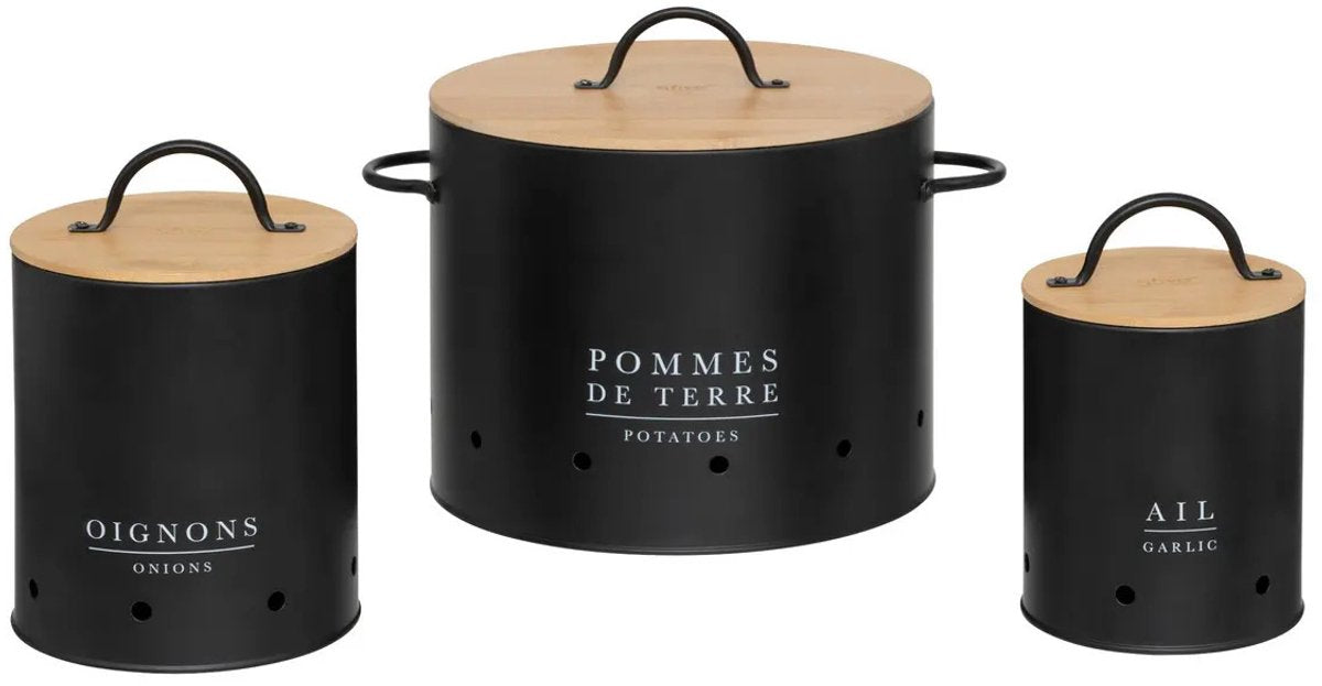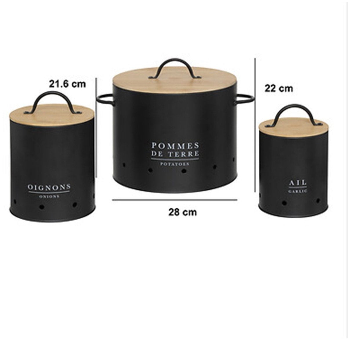 Uien, knoflook en aardappelen bewaar potten/blikken set van metaal met een bamboe houten deksel in de kleur zwart. Houd je groente langer vers met deze stijlvolle en functionele bewaar potten met luchtgaatjes. Gemaakt van metaal en bamboe hout, biedt deze pot niet alleen een veilige opslagoplossing voor je uien, maar voegt hij ook een vleugje elegantie toe aan je keuken. De zwarte metalen constructie met houten deksel zorgt voor een moderne en natuurlijke uitstraling, terwijl de luchtgaten zorgen voor voldoende ventilatie, waardoor de etenswaren langer vers blijft en niet gaat schimmelen. Bewaar je voedsel op een elegante en effectieve manier met deze bewaar potten. Afmeting: ca. 22 x 21 x 28 cm. Materiaal: metaal/hout. Merk: 5Five.
