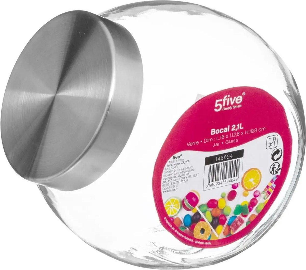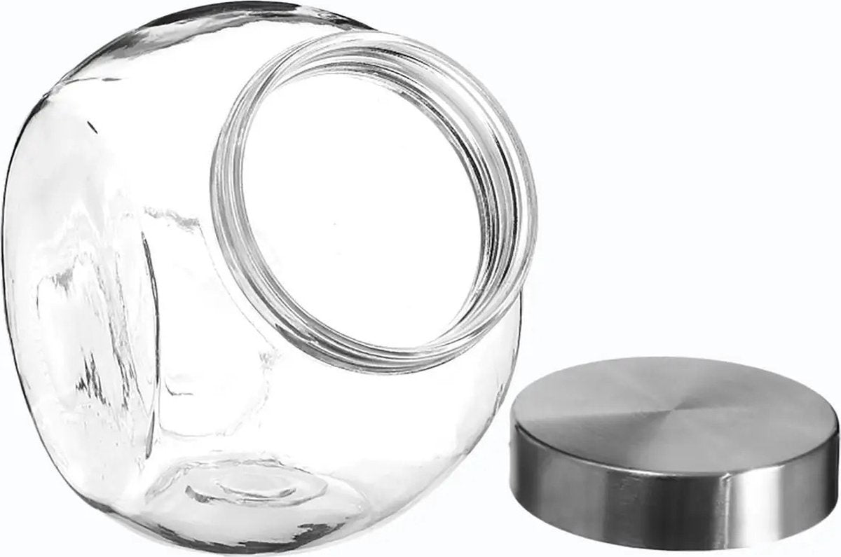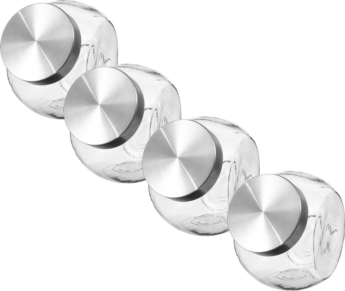 4 stuks voorraadpot met deksel. De voorraadpot is gemaakt van glas met een schroefdop deksel van RVS die ervoor zorgt dat de pot luchtdicht is afgesloten. De pot is uitermate geschikt is voor langdurig droog voedsel in te bewaren zoals koekjes, snoep, rijst, pasta, zout of suiker. Deze snoep pot heeft 2 platte zijdes waardoor hij rechtop kan staan of zoals een klassieke snoeppot op de zijkant. De voorraadpot is vaatwasser bestendig maar de deksel niet, deze wordt geadviseerd om met de hand af te wassen. De inhoud van de pot is circa 2,1 liter/2100 ml. Afmetingen: L19,5 x B12,8 x H17,3 cm. Merk: Five.