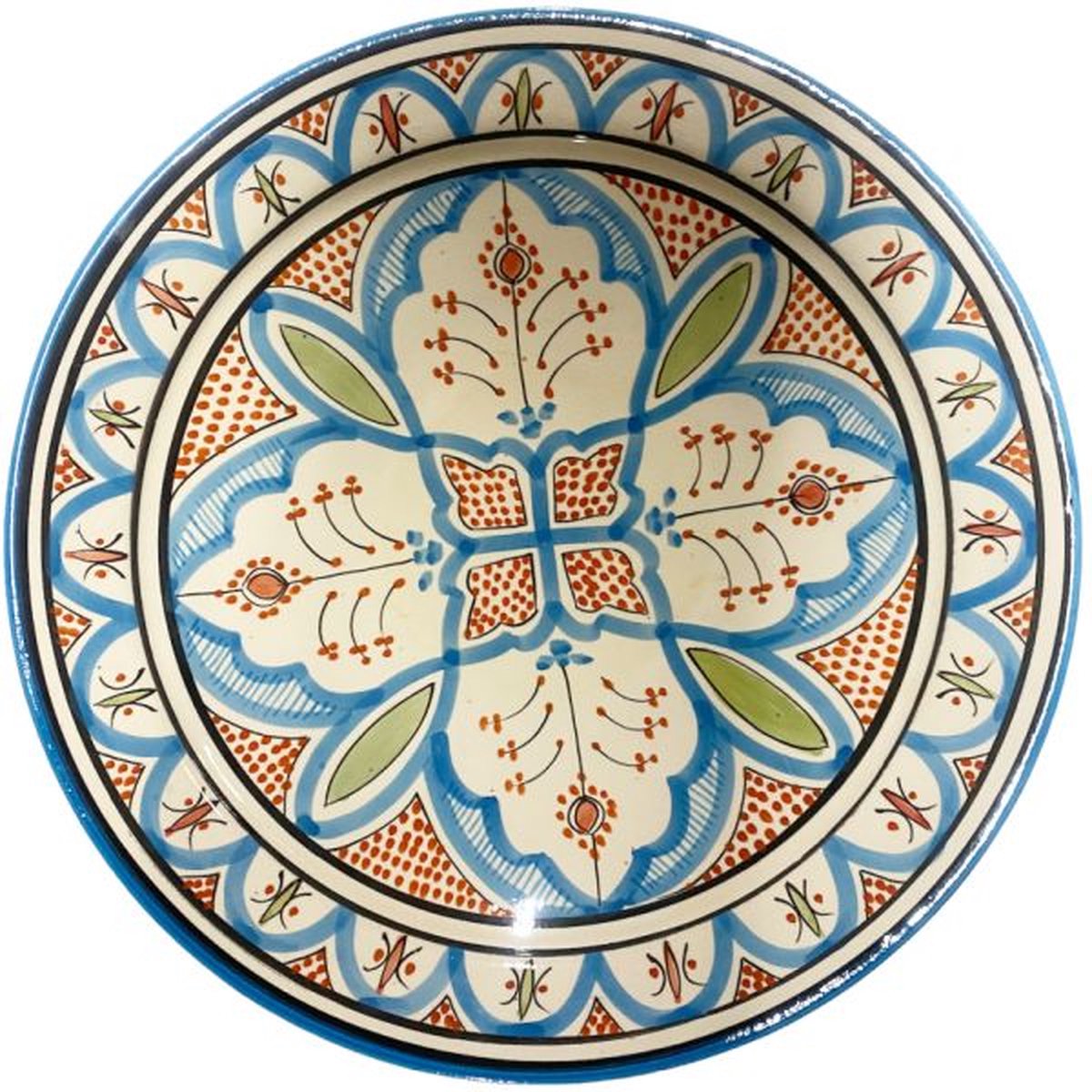Sierlijke handgemaakte Marokkaanse schaal hemelblauw met zeer prachtige patronen in verschillende kleuren.