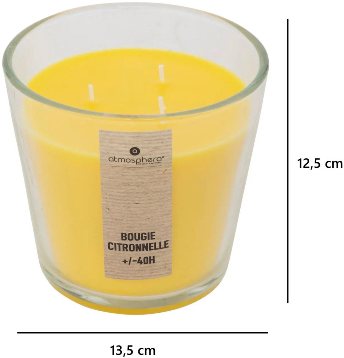 2x creëer een warme en uitnodigende sfeer in huis met deze grote geurkaars in het heerlijke citronella aroma in de kleur geel. Gegoten in een transparante glazen houder, met 3 lonten, verspreidt deze kaars een geur die je zintuigen prikkelt. Citronella heeft een sterke citroen of citrus geur.