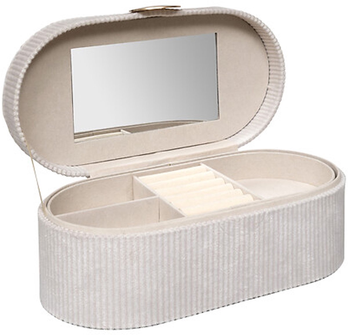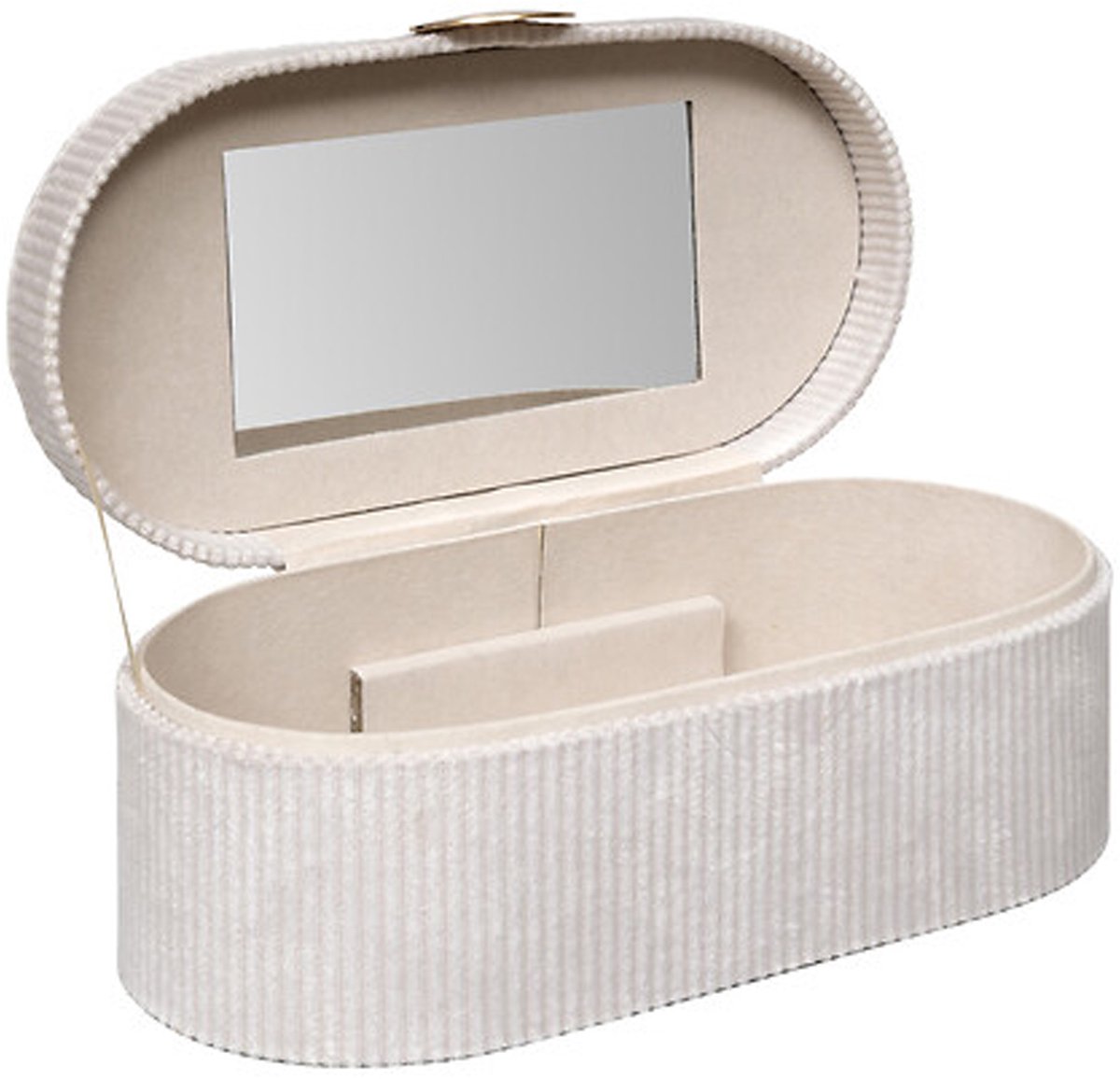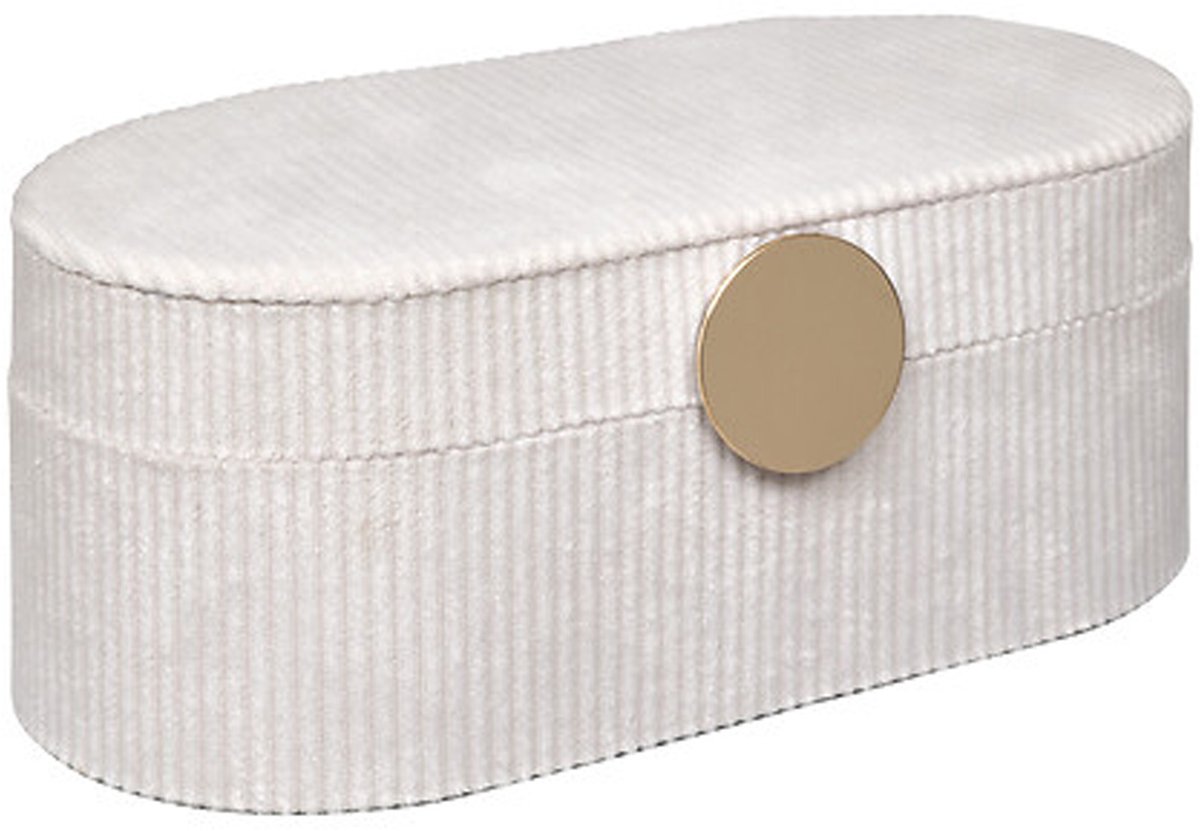 Sieradenkistje Bijou in het creme. Berg je sieraden stijlvol op met dit prachtige juwelenkistje in creme kleur met magneetsluiting en spiegeltje! Dit compacte kistje met afmetingen van 25 x 13 x 10 cm is perfect om al je ringen, oorbellen, kettingen en armbanden overzichtelijk te bewaren. Dankzij de handige vakjesindeling houd je alles netjes gescheiden en binnen handbereik. Ideaal voor thuis op je nachtkastje of om mee te nemen op reis. Een perfecte mix van functionaliteit en elegantie! Een erg mooi opberg kistje die perfect gegeven kan worden als Moederdag cadeau. Met dit sieradenkistje blijven je schatten niet alleen veilig, maar ook stijlvol opgeborgen. Tijd om te schitteren!