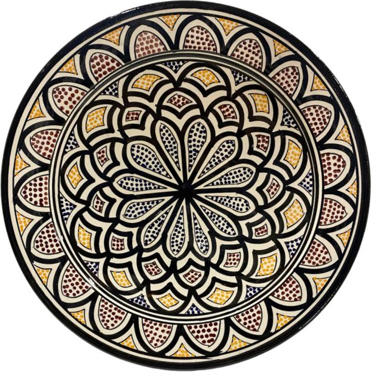 Fraaie handgemaakte Marokkaanse schaal met motieven in de kleuren zwart, oranje, rood en blauw. De motieven zijn met de hand... Lees meer