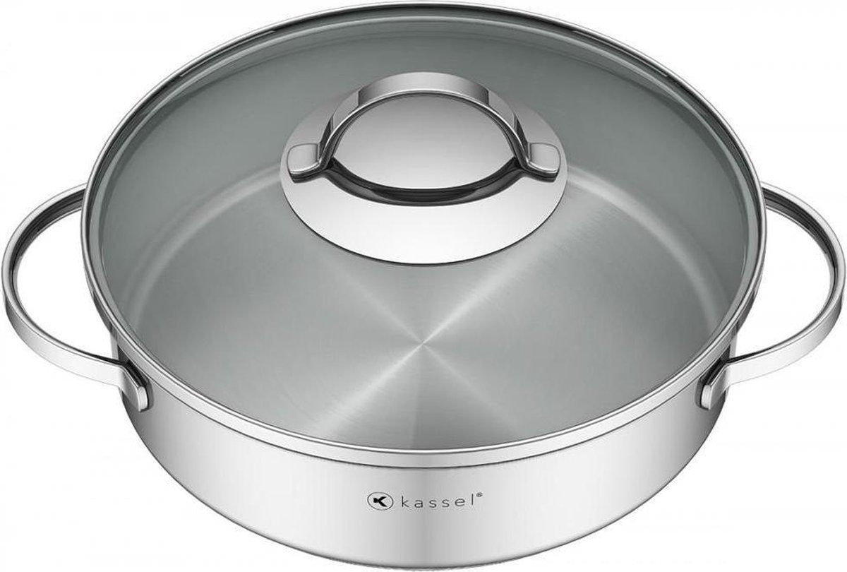 Deze Kassel kookpan die voorzien is van deksel is gemaakt van 18/10 staal / meer lagig rvs. Door deze materiaal bewerking zorgt dit voor een gelijkmatigere verwarming over de kookpan. De kook is hierdoor ook beter geïsoleerd en kan op alle warmtebronnen. Met een diameter van Ø 24 cm en een hoogte van 6,5 cm heeft deze kookpan een inhoud van 3.2Liter. Hier kunt u perfect uw aardappelen en groeten in koken.