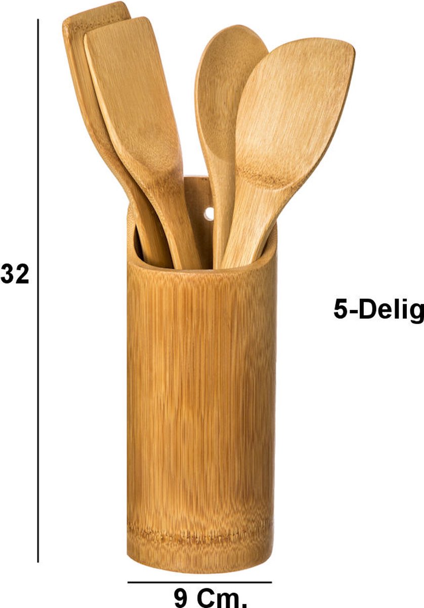 5-delige Houten Bamboe Keukengerei Set. Met deze mooie keukengerei set van bamboe heeft u het belangrijkste keukengerei altijd bij de hand. De 5-delige set bestaat uit een ronde bamboe houder met 4 verschillende soorten spatels.