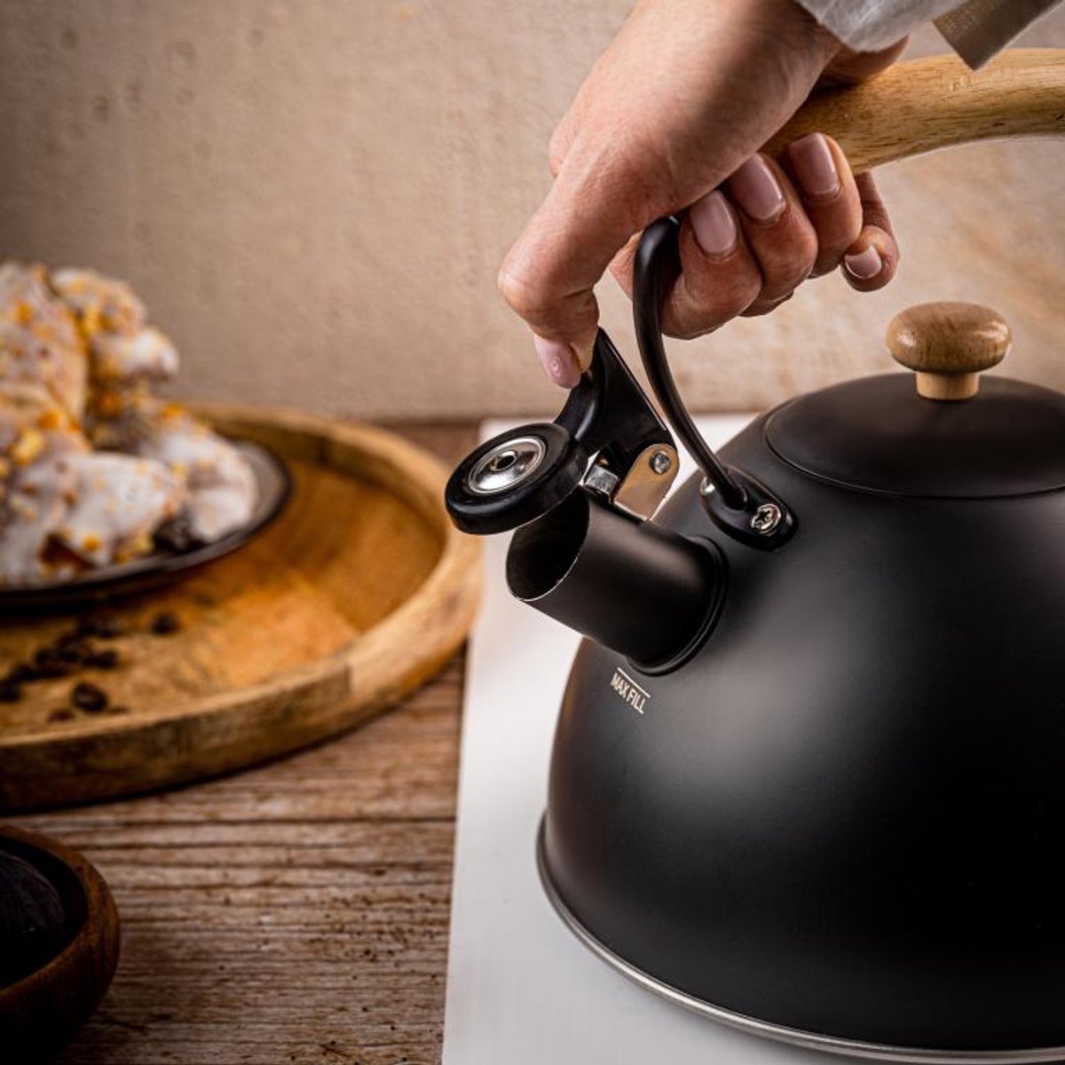 De ketel is gemaakt van hoogwaardig roestvrij staal, wat duurzaamheid en langdurig gebruik garandeert. De natuurlijke houten handgreep blijft comfortabel aanvoelen en is ontworpen om warmteoverdracht te minimaliseren. Het fluitsignaal klinkt luid en duidelijk zodra het water kookt, terwijl de schenktuit eenvoudig kan worden geopend via de geïntegreerde hendel aan de tuit.