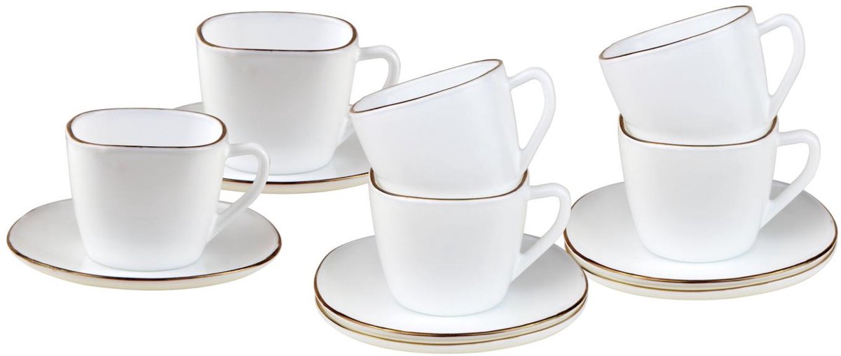 Complete set voor 6 personen: Deze 12-delige set bevat 6 vierkante kopjes en 6 bijpassende ronde schotels. Alles wat u nodig heeft voor een gezellig samenzijn.