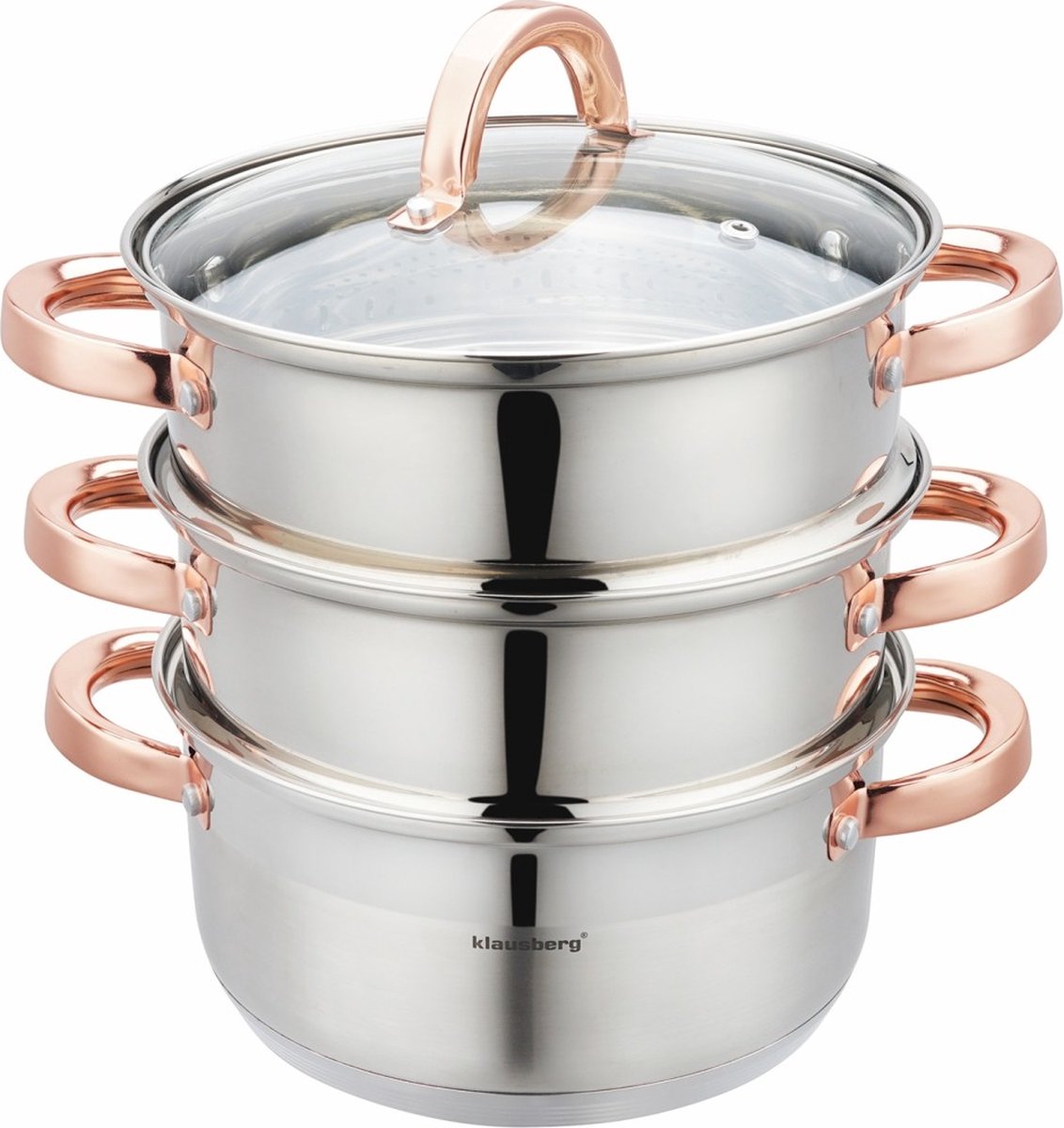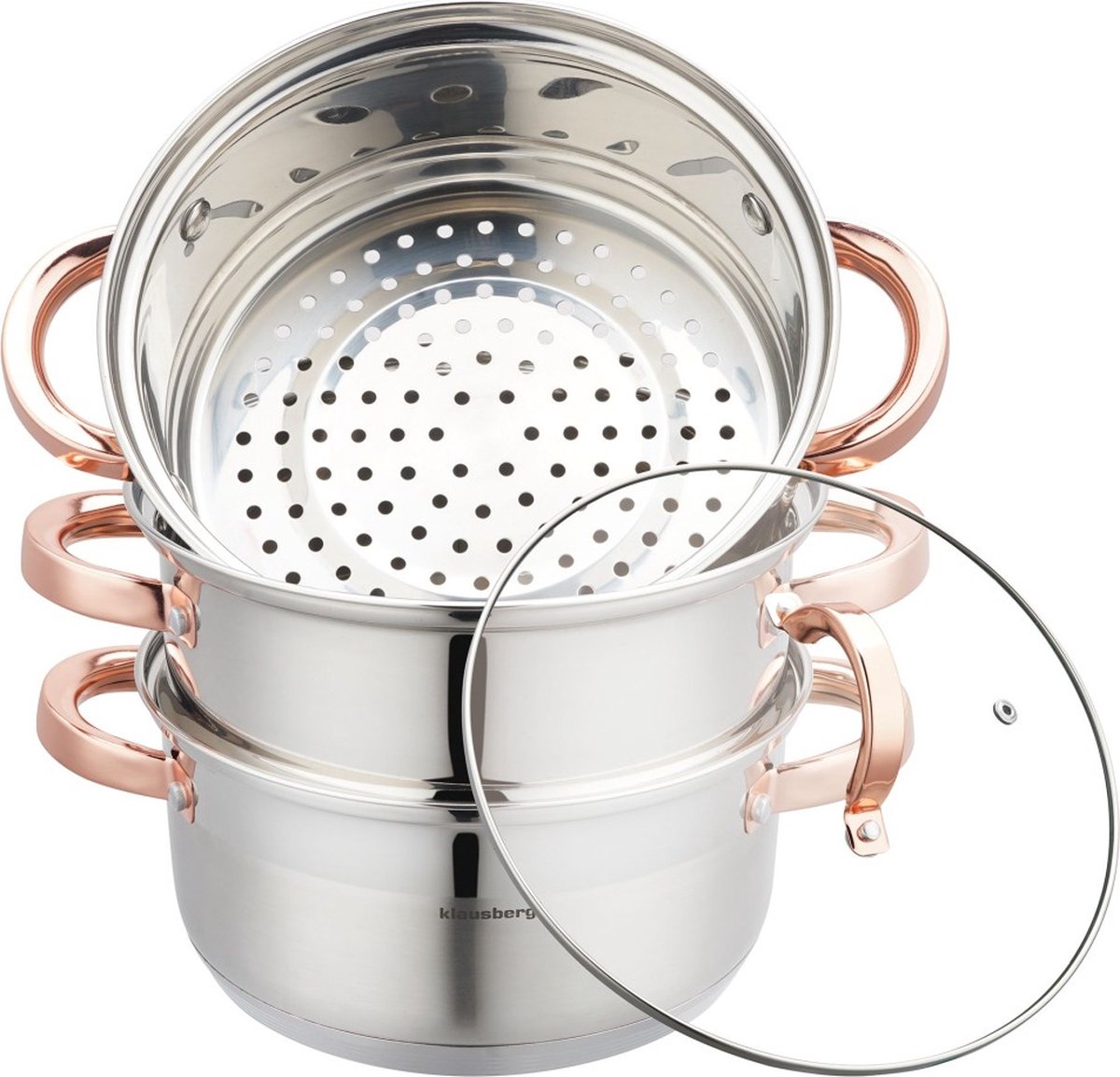 De Klausberg stoompan maakt koken tot een gemak. Door de meer-laagse rvs bodem van de pan zorgt dit voor een optimale warmte verspreiding. Door de afgeronde bodem is deze stoompan set gemakkelijk schoon te maken. Specificaties