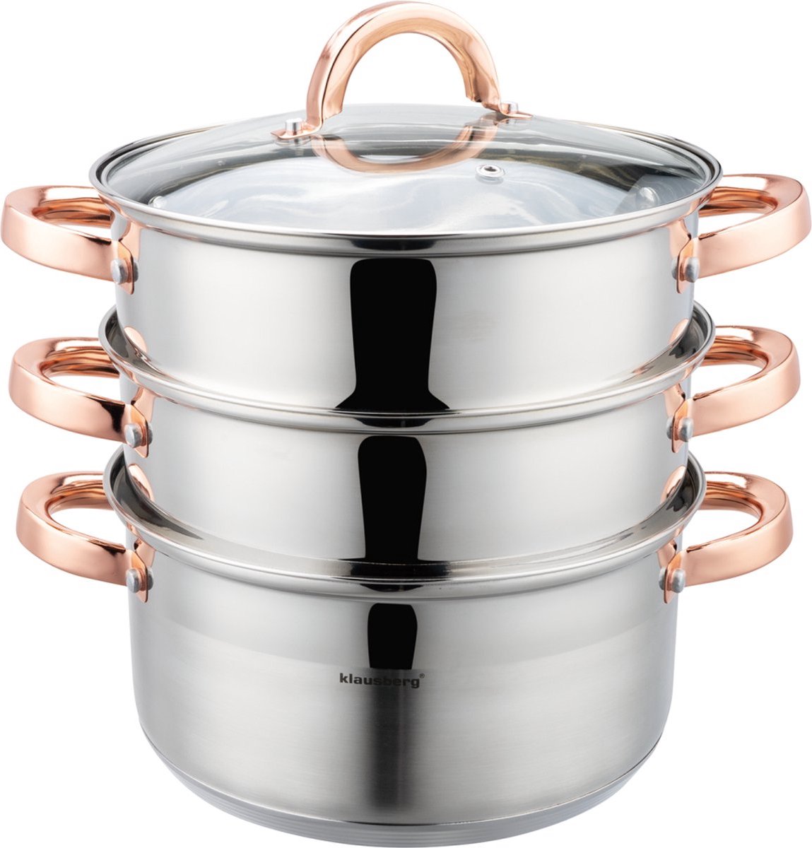 De Klausberg stoompan maakt koken tot een gemak. Door de meer-laagse rvs bodem van de pan zorgt dit voor een optimale warmte verspreiding. Door de afgeronde bodem is deze stoompan set gemakkelijk schoon te maken. Specificaties