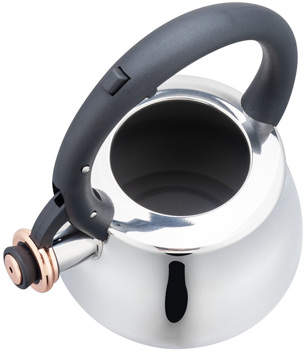 Deze moderne fluitketel is gemaakt van roestvrij staal en past met zijn tijdloze design bij ieder interieur en iedere smaak. Hij kookt binnen enkele minuten heet water voor een heerlijk kopje thee of koffie terwijl jij je op andere dingen kunt concentreren. Zodra het water kookt, activeert de stoom het geïntegreerde fluitje, dat luid genoeg is om andere huishoudelijke geluiden te overstemmen. Hierdoor kunt u ontspannen de kamer verlaten zonder te hoeven wachten op uw warme water.