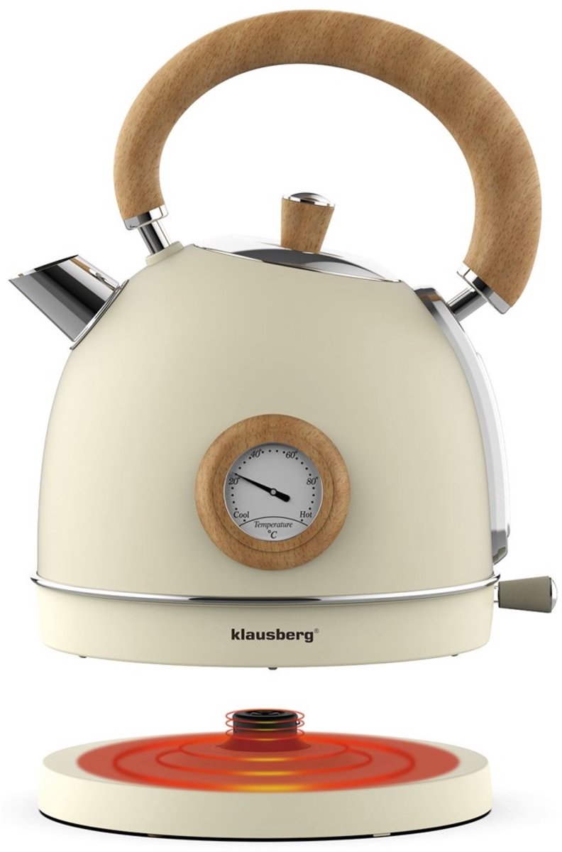 De elegante Klausberg elektrische waterkoker in crèmekleur combineert een retrostijl met moderne functionaliteit. Uitgerust met een praktische thermometer, waarmee u de watertemperatuur kunt controleren en de perfecte koffie kunt zetten – van groene thee tot oploskoffie. De metalen behuizing van roestvrij staal 304 garandeert duurzaamheid, terwijl de comfortabele handgreep met houtlook charme en comfort toevoegt.