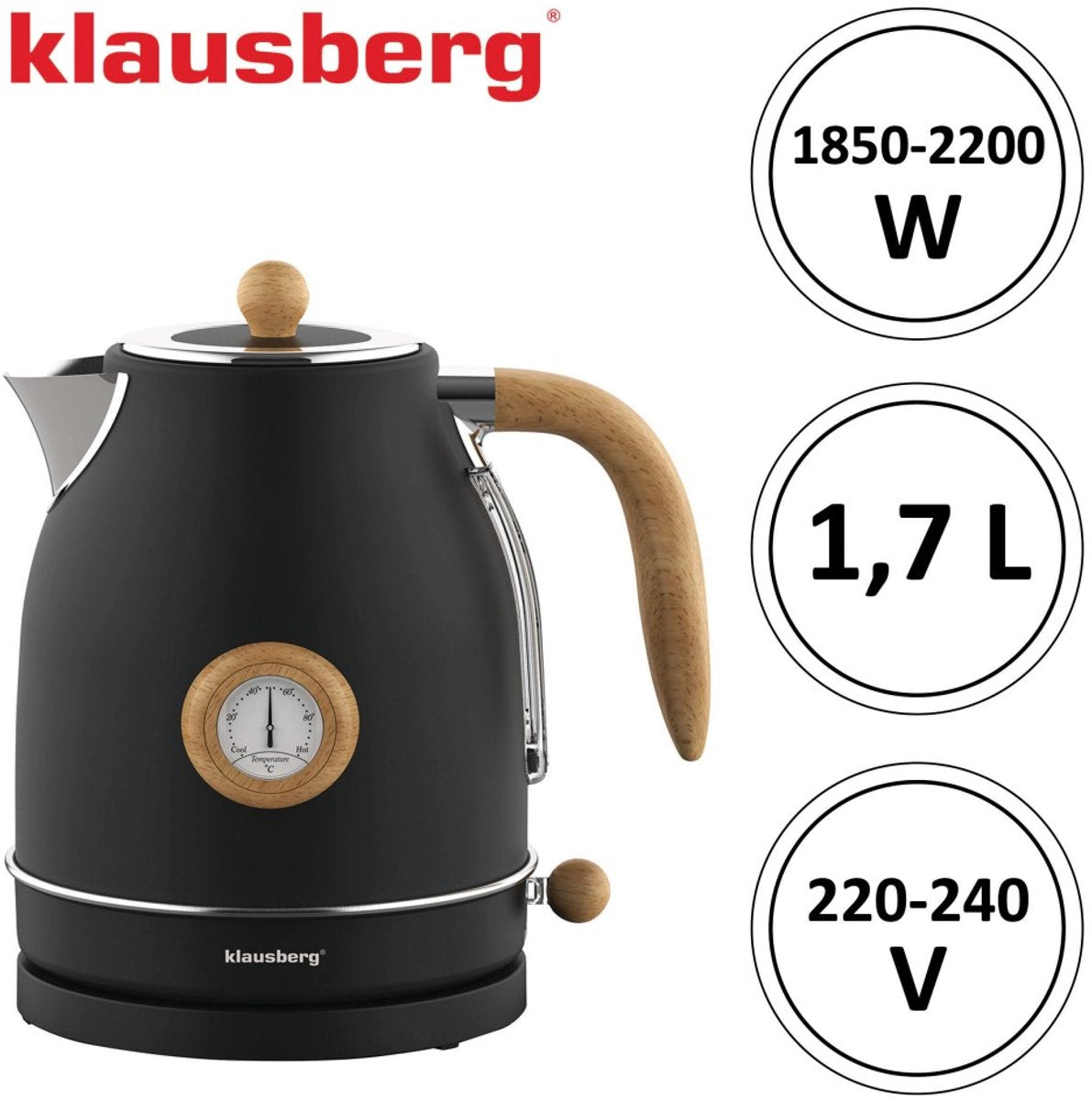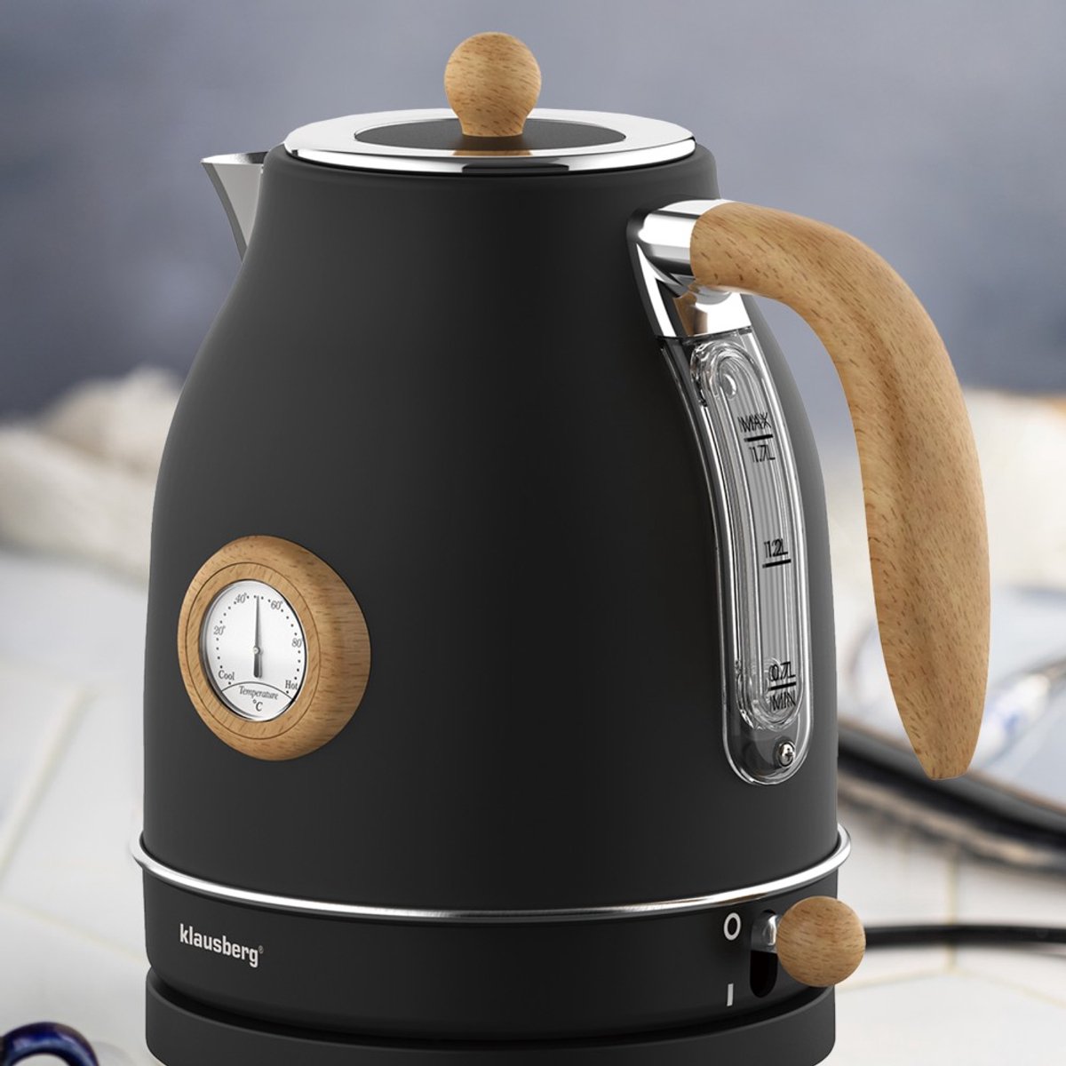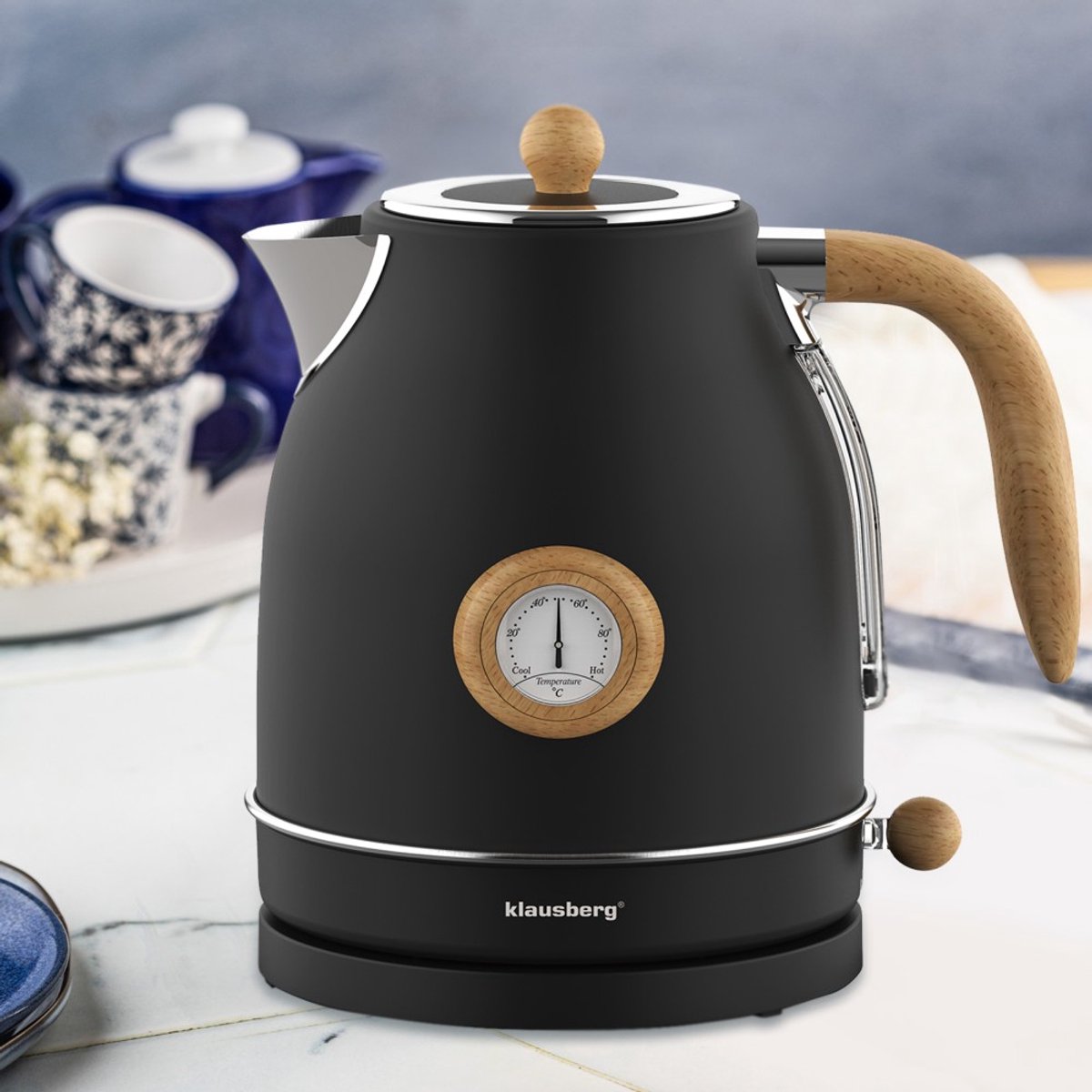 De Klausberg waterkoker, uitgevoerd in een elegante zwarte afwerking met houten accenten, combineert functionaliteit met tijdloos design. Uitgerust met een praktische thermometer verwarmt hij water tot de perfecte temperatuur – niet alleen voor kokend water, maar ook voor koffie, thee of infusies die een lagere temperatuur vereisen. Met een vermogen van 1850-2200 W kookt de waterkoker razendsnel en met een inhoud van 1,7 liter is hij ideaal voor zowel één persoon als het hele gezin.