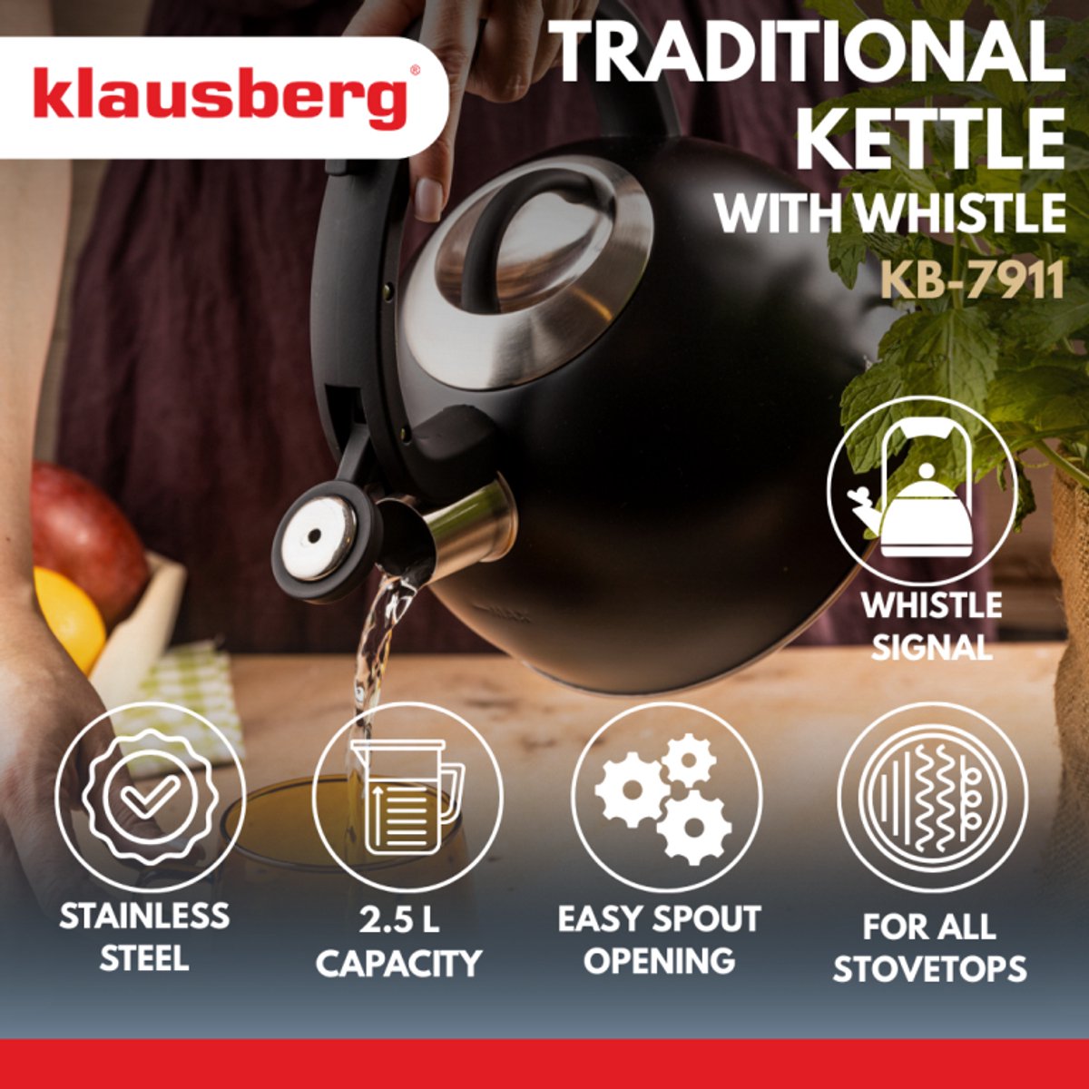 Klausberg 7911 - Fluitketel met fluit - 2.5 liter - RVS - zwart