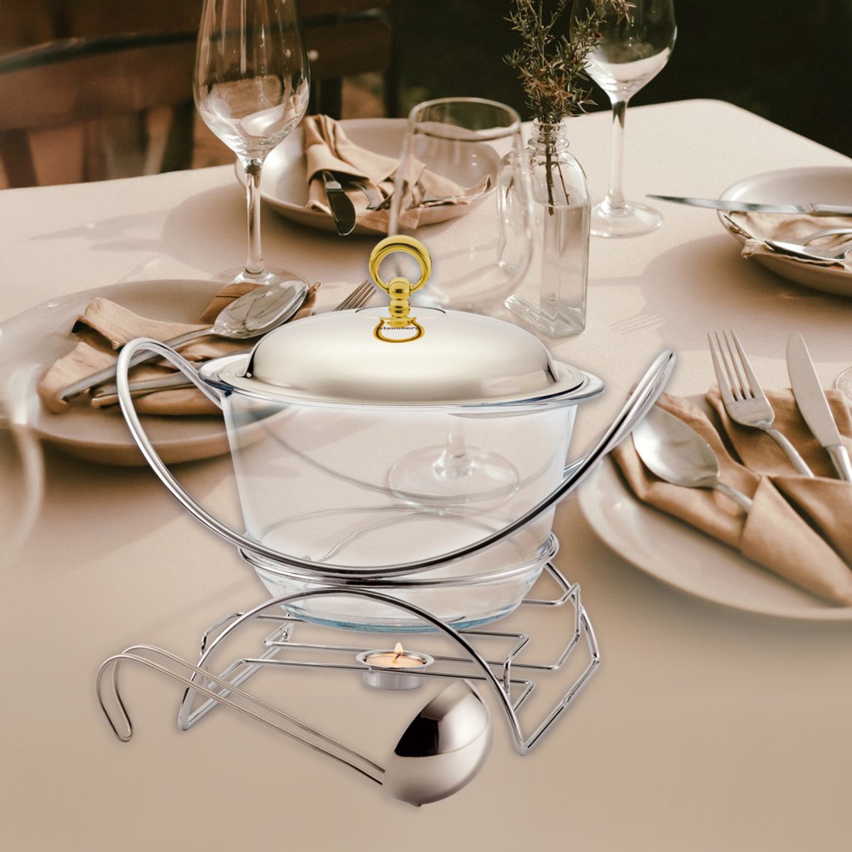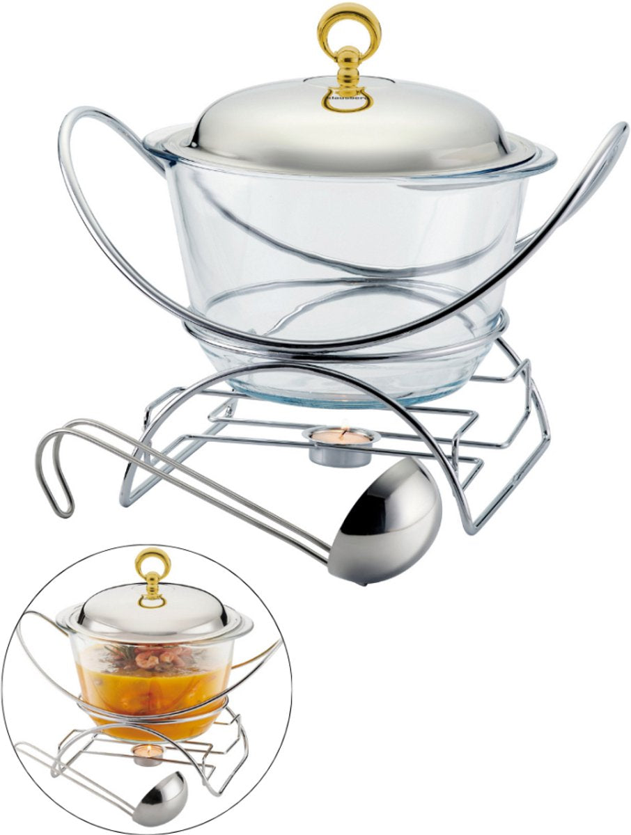 Glazen warmhoudschaal met roestvrijstalen voet, 4 L Deze elegante warmhoudschaal is een praktische oplossing voor het serveren van soepen, stoofschotels... Lees meer