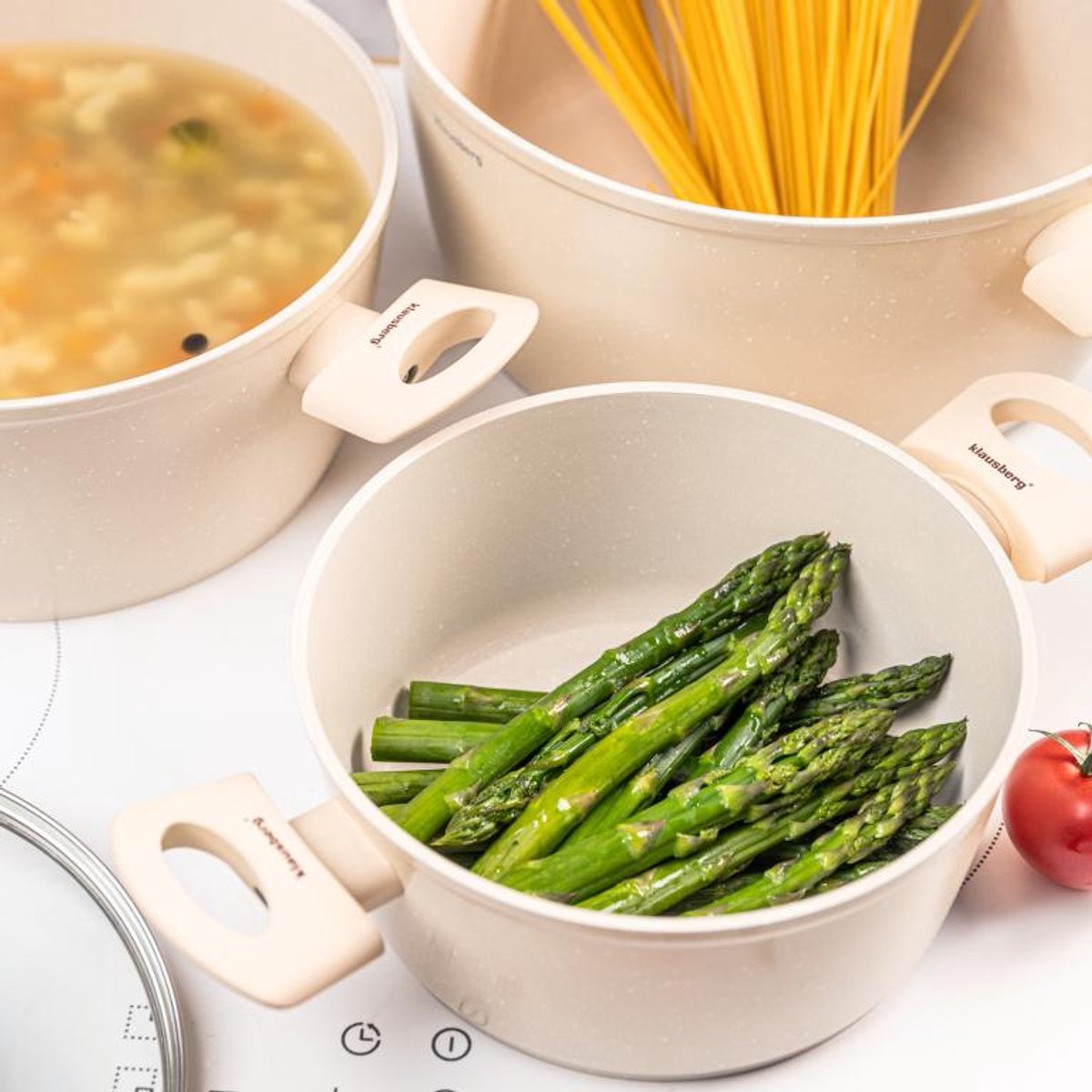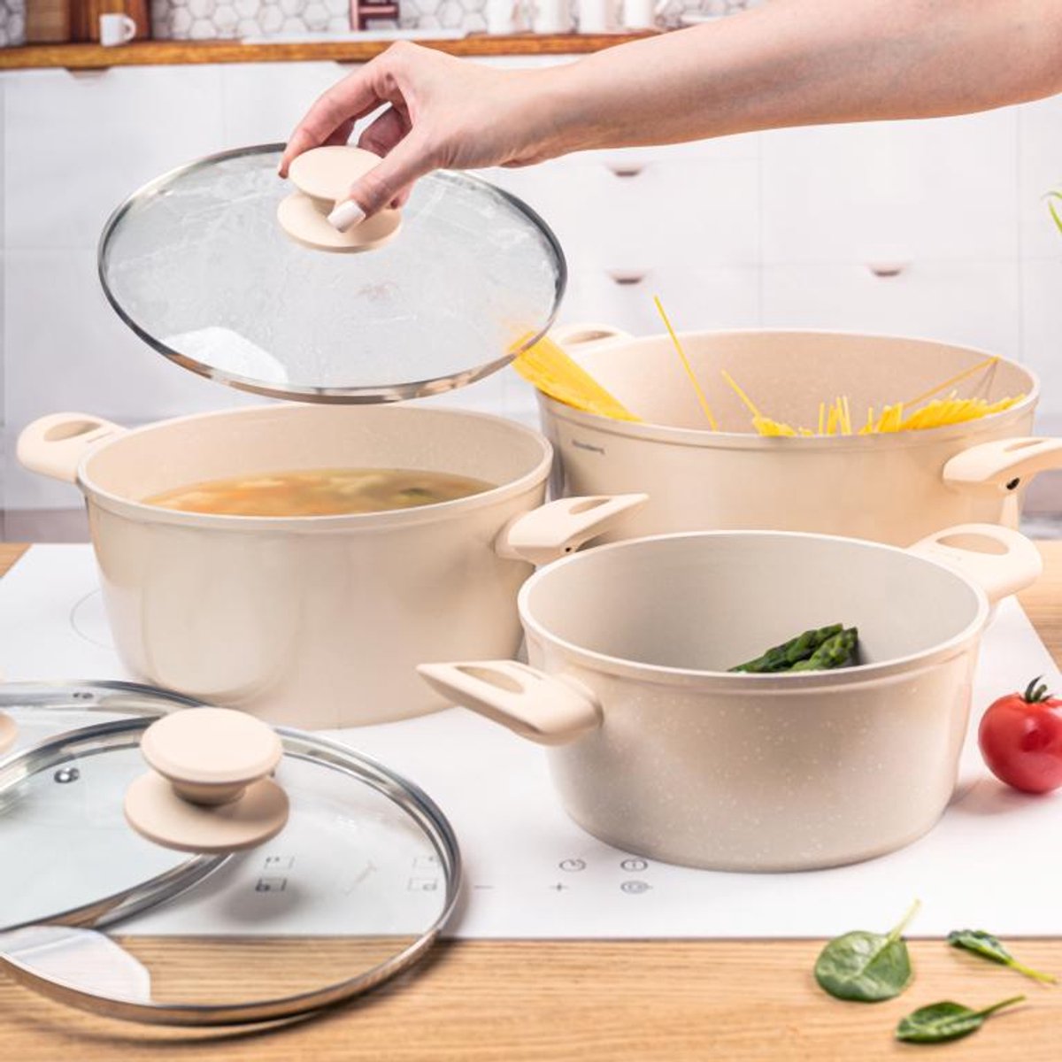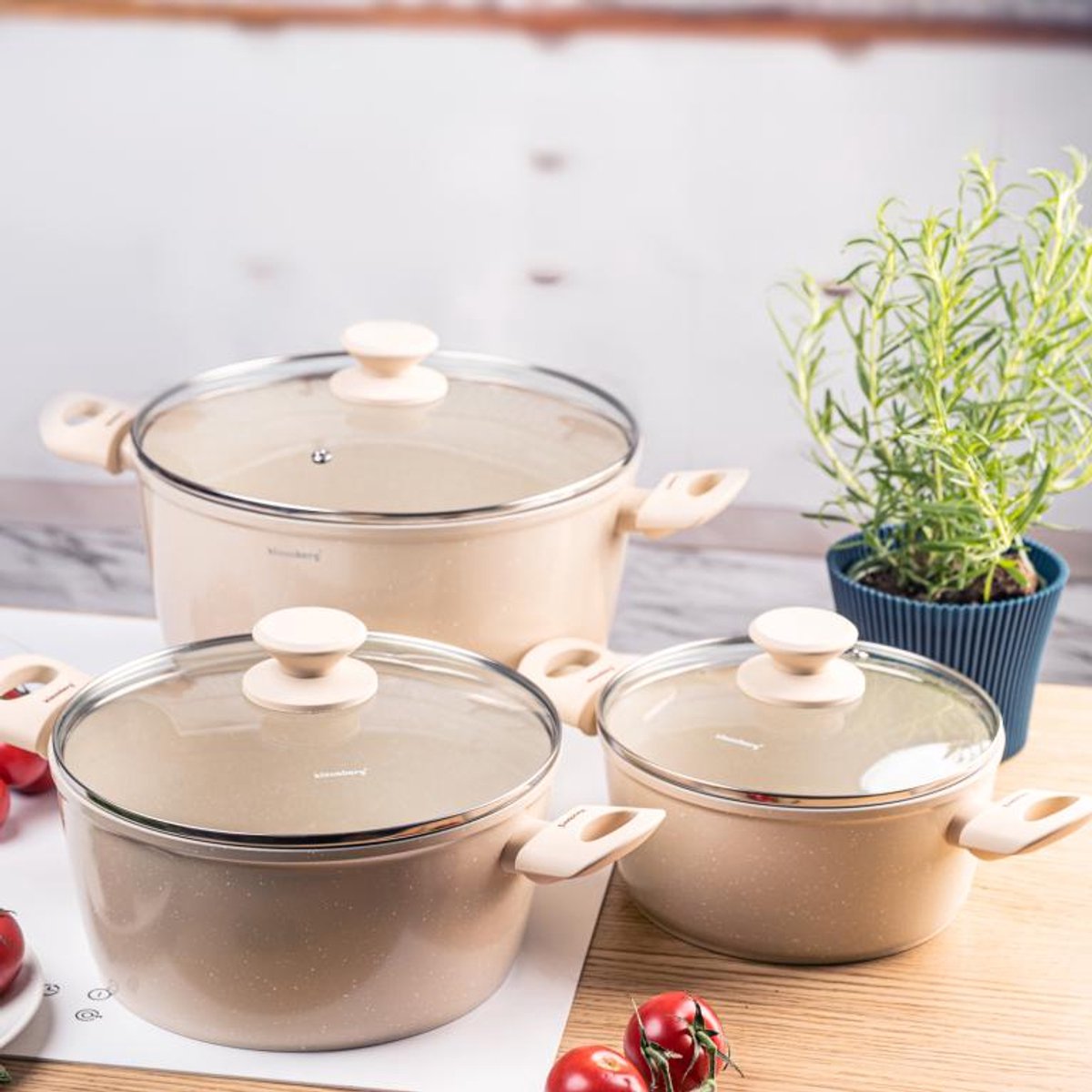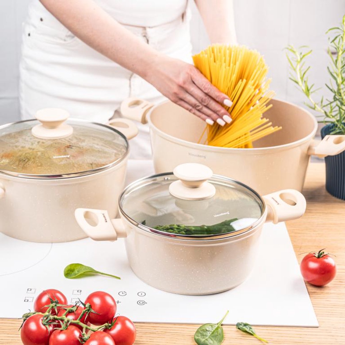 De Klausberg KB-7961 is een elegante 6-delige pannenset in moderne beige marble kleur. Deze set van 3 pannen met bijbehorende deksels beschikt over een hoogwaardige marmer anti-aanbaklaag voor gezond koken met minder vet. Het gietaluminium zorgt voor snelle en gelijkmatige warmteverdeling, wat energie bespaart. De geharde glazen deksels met stoomuitlaat laten u meekijken tijdens het koken. De comfortabele soft-touch handvatten zorgen voor een veilige grip. Geschikt voor alle kookzones, inclusief inductie, en bestand tegen de vaatwasser.