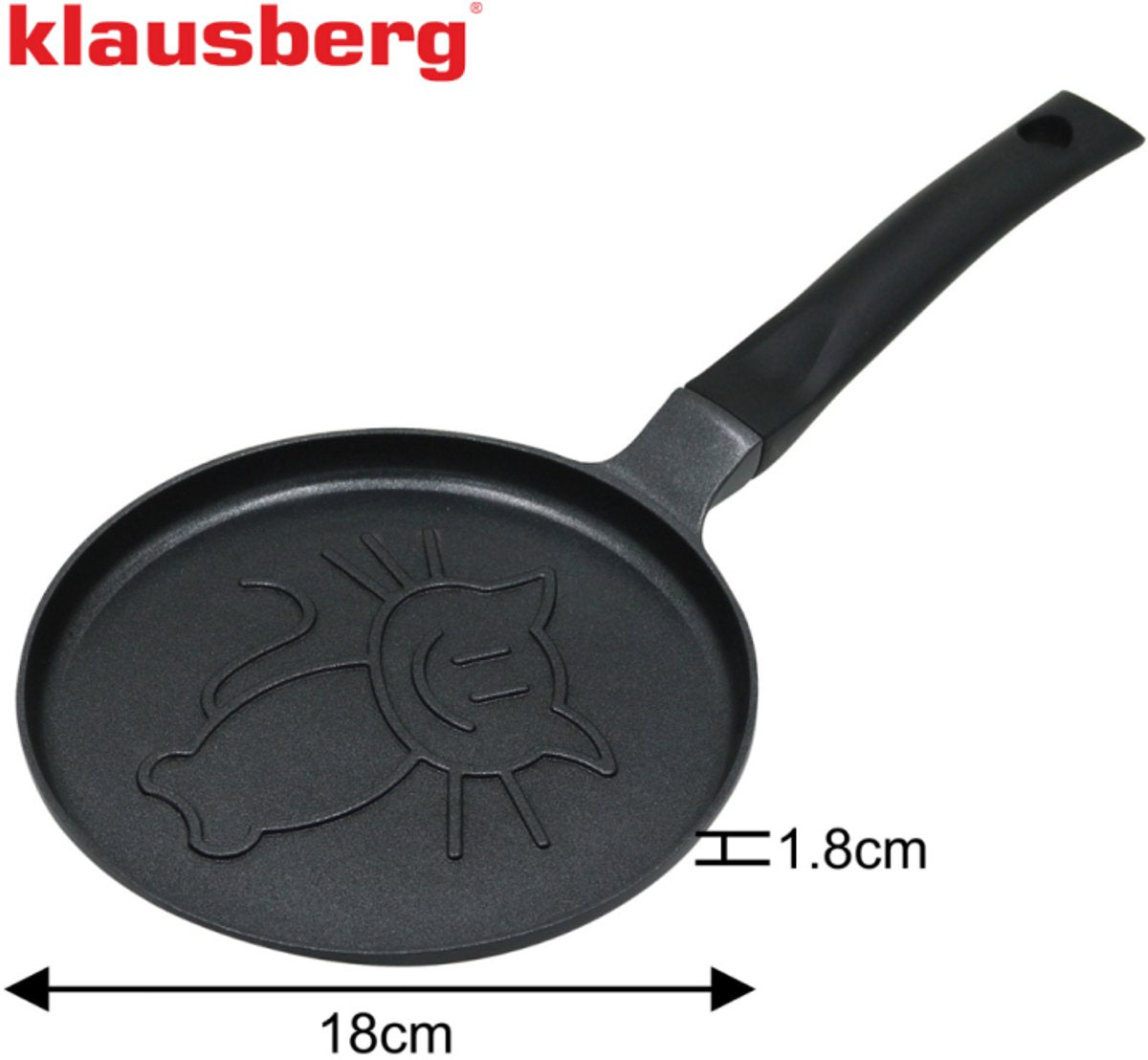 Ontdek de Klausberg KB-7973 pannekoekenpan met schattig kattenmotief. Deze compacte pan van 18 cm diameter voorziet elke pannenkoek of omelet van een speels kattenpatroon. Gemaakt van aluminium met hoogwaardige antiaanbaklaag voor perfecte bakresultaten zonder aanbakken. Geschikt voor alle kookzelen inclusief inductie.