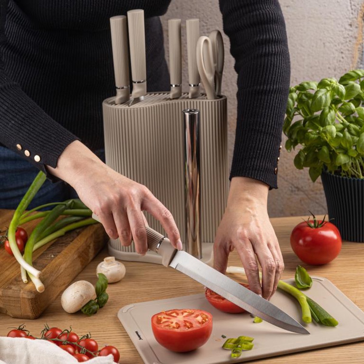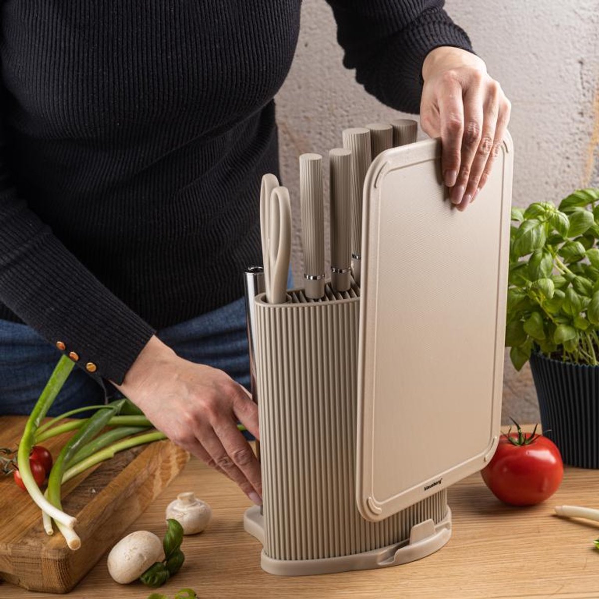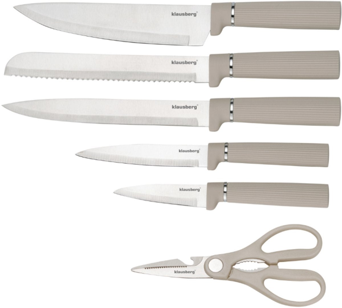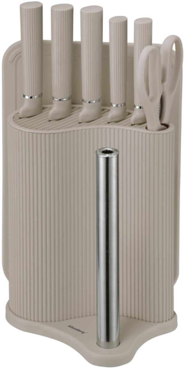 De Klausberg KB-7978 keukenset is een complete 8-delige set in een moderne beige uitvoering. Deze set bevat 5 messen van roestvrij staal een multifunctionele keukenschaar een snijplank met opvangrand en een messenblok met ingebouwde papierrolhouder. Het minimalistische design in zandkleur past perfect in zowel moderne als klassieke keukens.