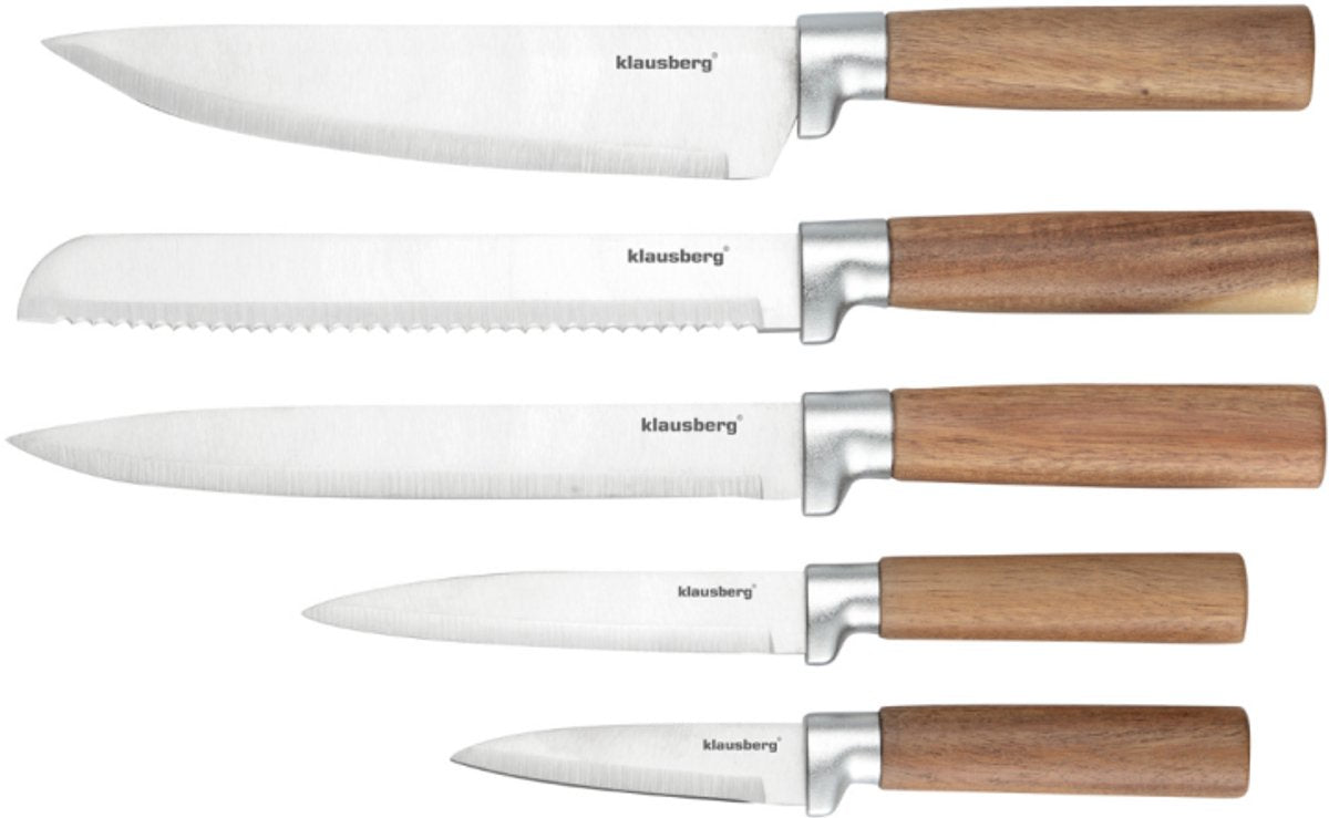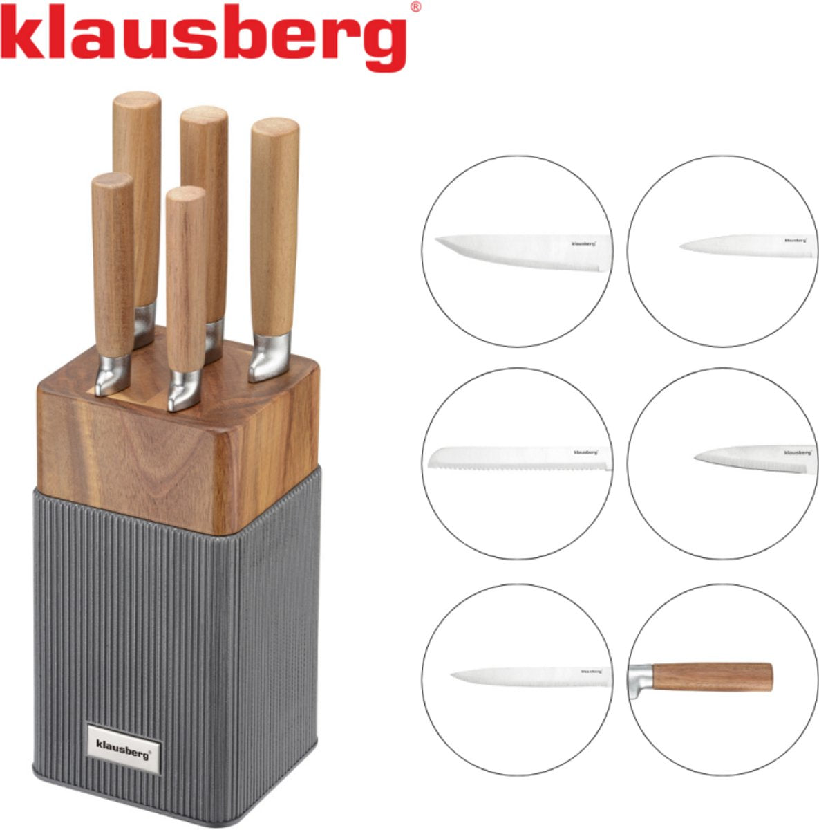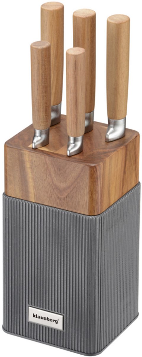 De Klausberg KB-7983 messenset combineert functionaliteit met een warm modern design. Deze 6-delige set bevat 5 essentiële keukenmessen van roestvrij staal en een stabiel messenblok van acaciahout met grafiet-grijs kunststof accenten. De messen zijn uitgebalanceerd en voorzien van ergonomische handvatten voor comfort en precisie tijdens het snijden.