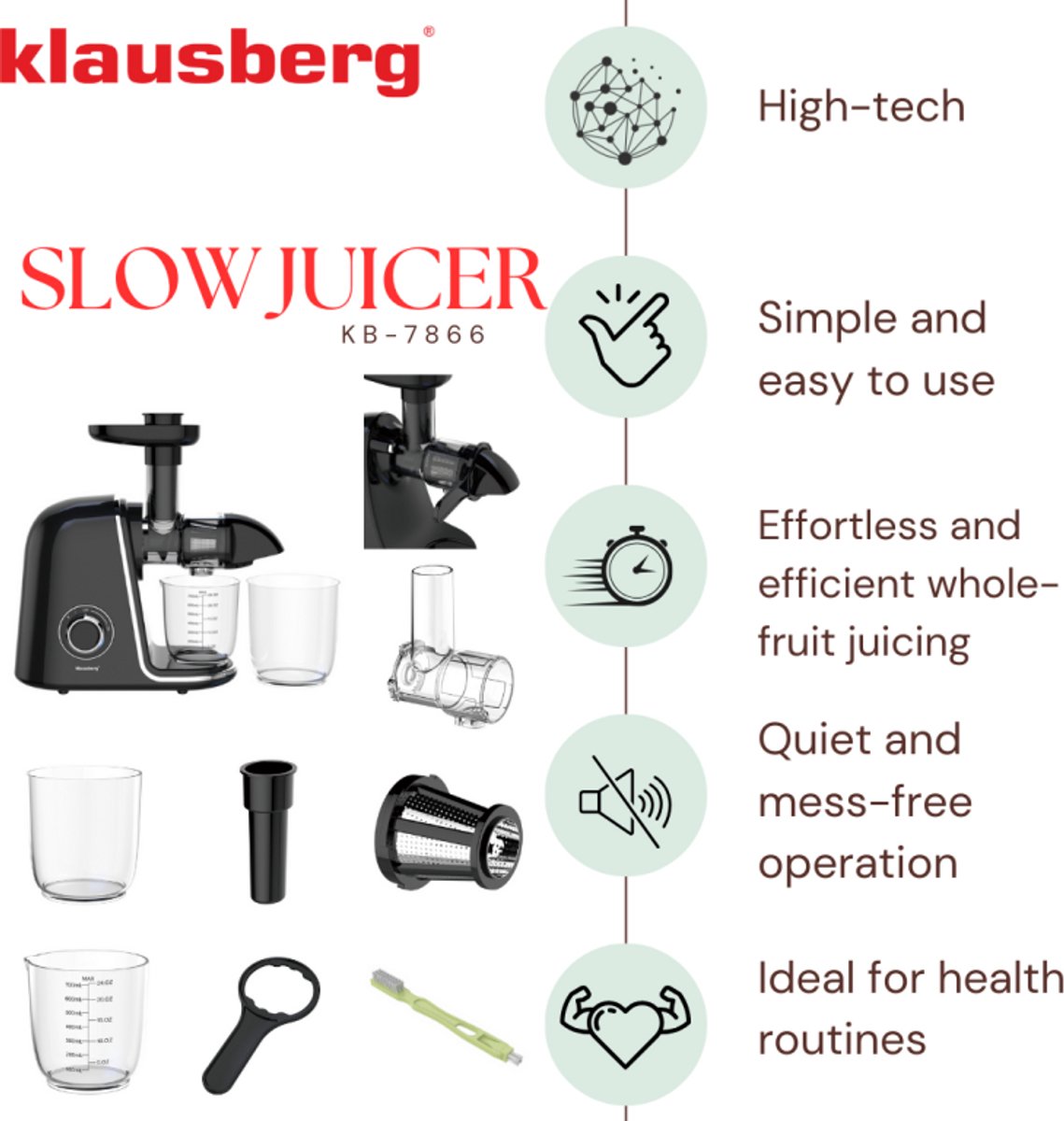 De Klausberg KB-7861 is perfect voor dagelijks gebruik, of je nu een enkel glas sinaasappelsap perst of een complete groentesapkuur voorbereidt.