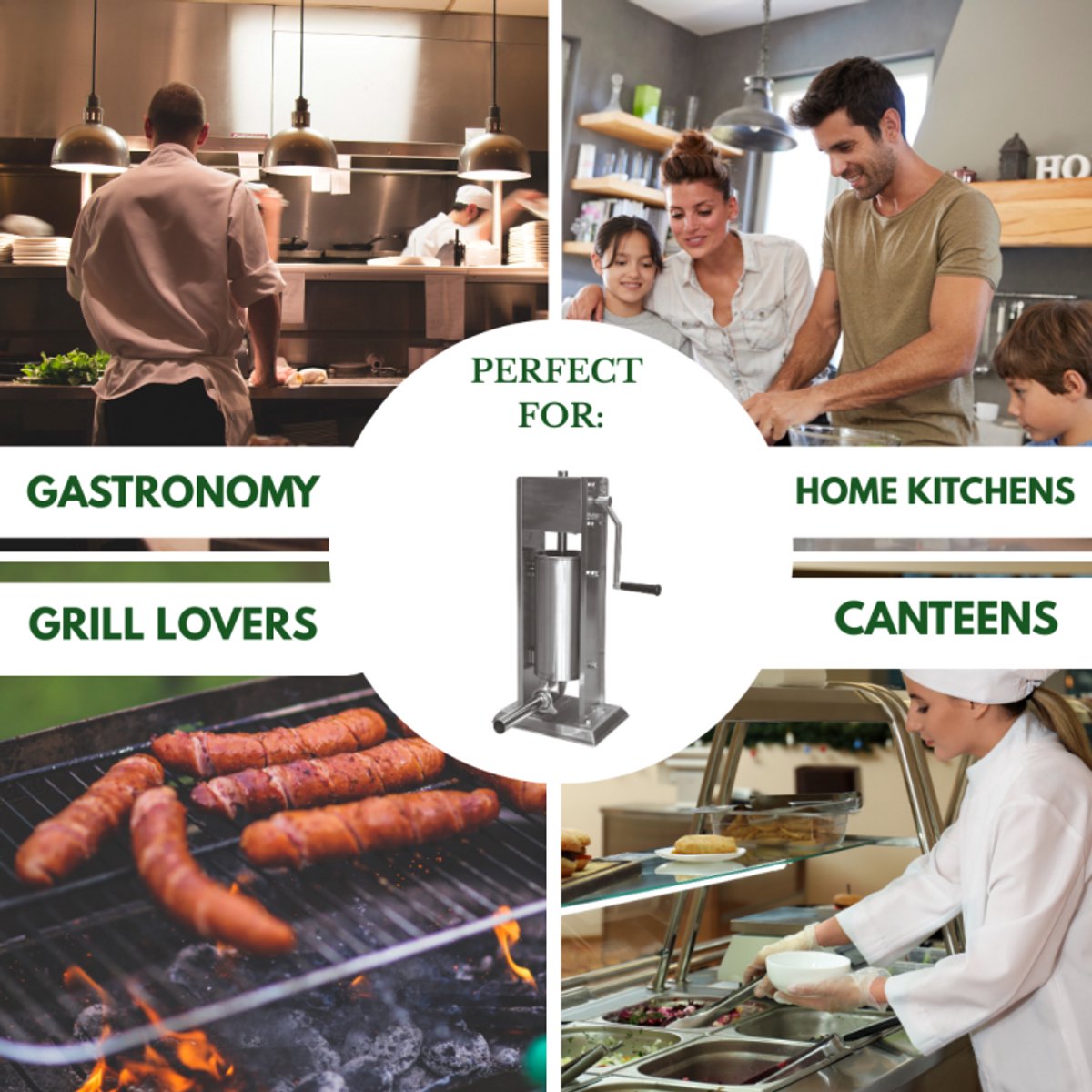 Ideaal voor het maken van vers gevulde worsten, het vullen van gevogelte of het bereiden van andere zelfgemaakte vleeswaren. Dankzij de verticale opbouw en de meegestuurde trechters kunt u eenvoudig wisselen tussen verschillende recepten en formaten. Geschikt voor alle soorten natuurlijke en kunstmatige darmen.