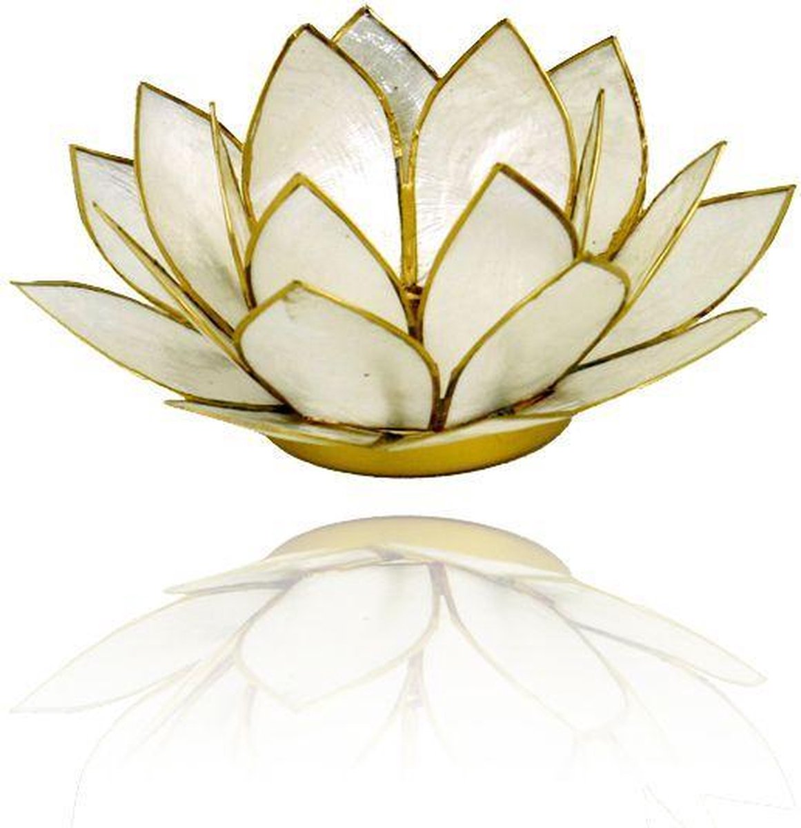 | Lotus sfeerlicht Capiz - parelmoer - met goudkleurige randen De Lotus is het symbool van duisternis naar licht, van onwetendheid naar weten. De lotus staat ook symbool voor de 7 energiecentra in het menselijk lichaam, chakra's genoemd. Over Capiz schelpen: Deze worden gemaakt van de buitenste laag van een zeeweekdier, waarvan de wetenschappelijke naam placuna placenta is, ook wel de venster-oester genoemd. De Capiz schelpen uit de Philippijnen heten zo omdat ze oorspronkelijk gevangen werden uit de ondiepe kustwateren bij de stad Capiz, op het eiland Panay. Eenmaal goed schoongemaakt zijn deze schelpen van nature doorzichtig, en als ze geschilderd zijn geven ze met een lichtje erin een bijzonder fraai kleurenspel. -Lotus sfeerlicht parelmoer goudrand - 13.5 cm - Maat: S