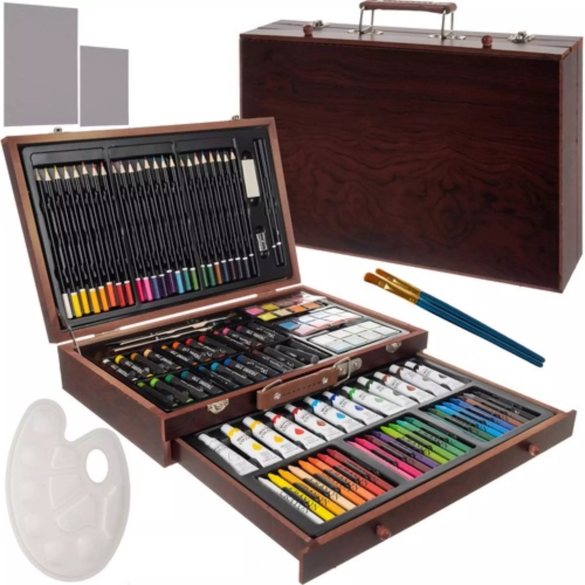 De schilderset wordt geleverd in een praktische houten koffer met sluiting en handvat, wat het vervoeren van de inhoud comfortabel en eenvoudig maakt.