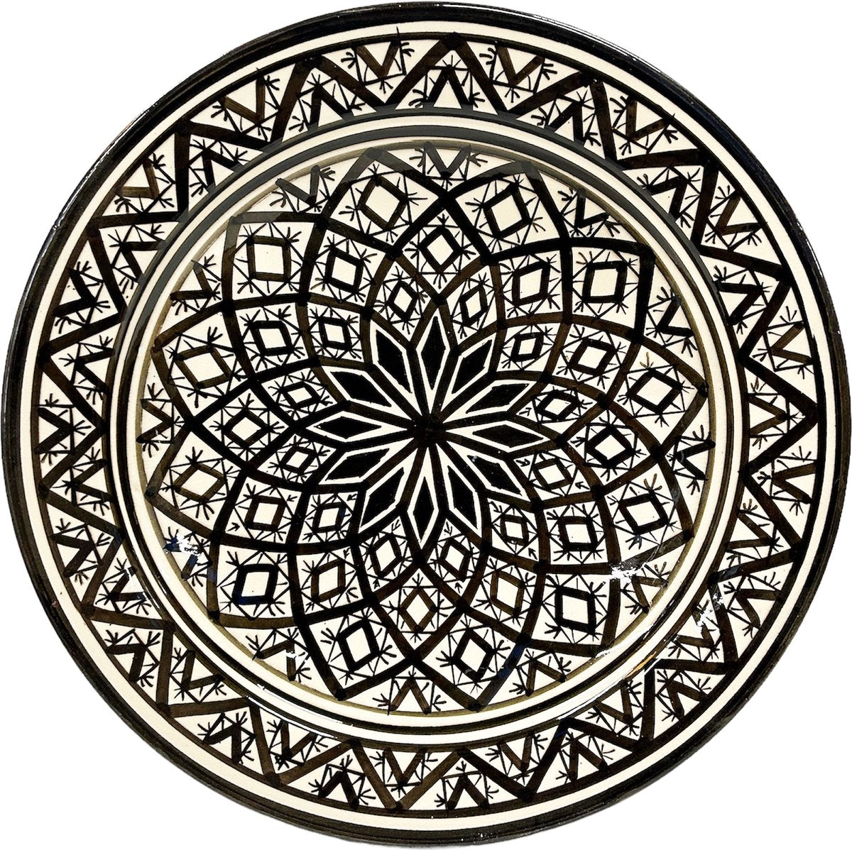Ontdek de ingetogen pracht van ons met de hand vervaardigde Marokkaanse aardewerk met deze schaal in zwart-wit, een tijdloos pronkstuk voor je interieur! Met een diameter van 35 cm voegt deze schaal een vleugje elegantie toe aan elke tafelsetting. Elk stuk is zorgvuldig met de hand gemaakt door vakmensen in Marokko, wat resulteert in een uniek en authentiek kunstwerk.