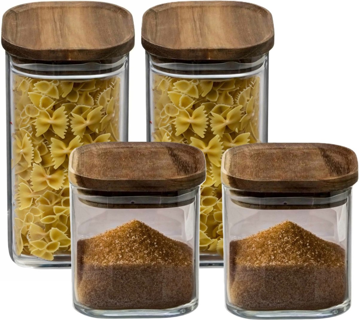 Set van 4x keuken voedsel voorraadbussen/potten van glas met acacia houten deksel 0.6 en 1.6 Liter inhoud. De deksel van deze voorraadpot is van hout en beschikt over een hermetische siliconen afdichting en is zeer geschikt om langdurig voedsel in te bewaren. In deze set: 2x 600 ML en 2x 1600 ML. Afmetingen: 10 x 14 cm / 10 x 22 cm. De bussen/potten zijn vaatwasser bestendig. behalve de deksel.