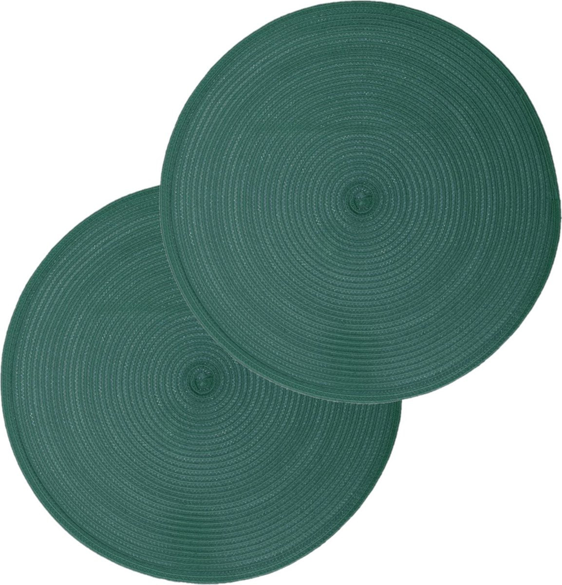 12 stuks ronde tafel diner placemats, gemaakt van gevlochten kunststof, in de kleur emerald groen. Diameter: 38 cm. Bescherm uw tafel tegen vlekken en krassen met deze stijlvolle placemats. Reinigen: Afnemen met een vochtige doek, eventueel afdrogen met een theedoek. Tafel onderleggers - Tafeldecoratie.