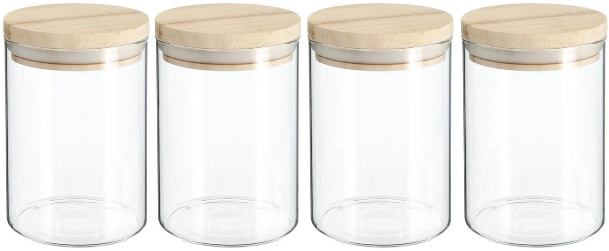 4 stuks voorraadbus / voorraad pot van glas met een inhoud van 600 ml. De deksel van deze voorraad pot is van hout en beschikt over een hermetische siliconen afdichting. Deze voorraad pot is zeer geschikt om langdurig voedsel in te bewaren zoals rijst, pasta, zout of suiker. Tevens kan deze pot uitstekend dienen als snoep pot. Afmeting: 10 x 14 cm. Inhoud: ca. 600 ml. De pot is vaatwasser bestendig, de deksel echter niet. Bij voorkeur met de hand wassen.