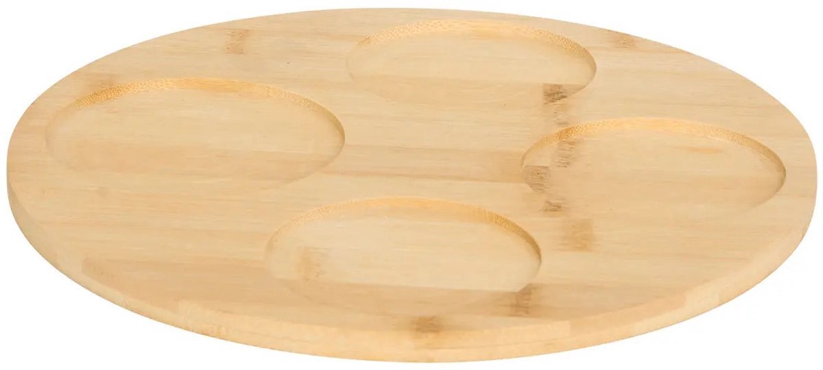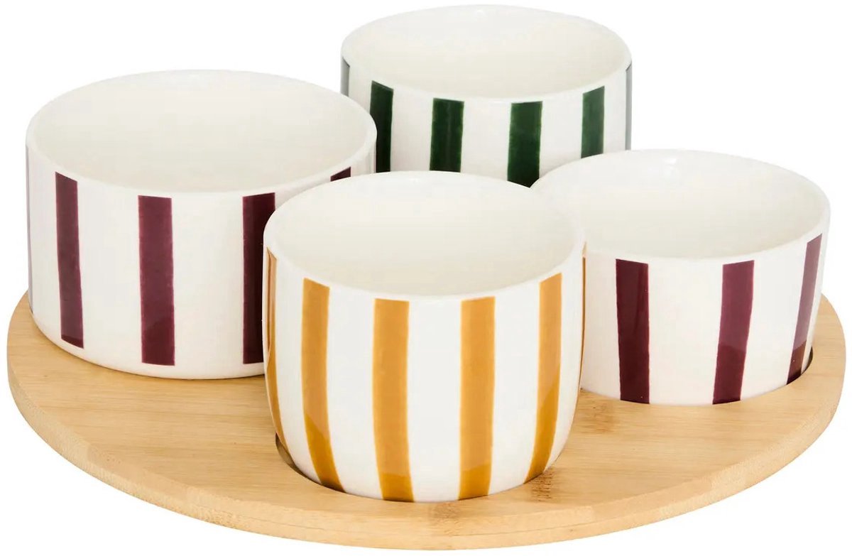 De ronde onderplaat is gemaakt van duurzaam acaciahout met een natuurlijke uitstraling. De bijgeleverde schaaltjes zijn vervaardigd van kwalitatief aardewerk en zijn eenvoudig schoon te maken in de vaatwasser. Let op: vanwege het materiaal zijn de schaaltjes breekbaar.