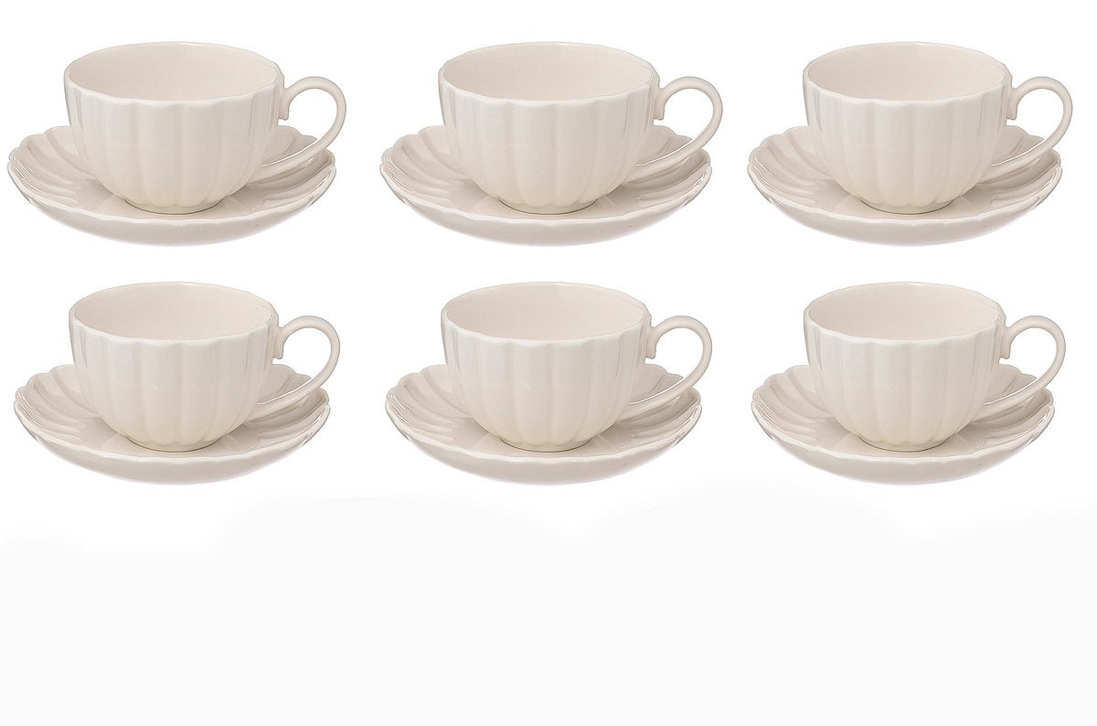 Set van 6 Witte Porseleinen Koffiekopjes met Schotel – 22 cl – Elegant Geribbeld Design