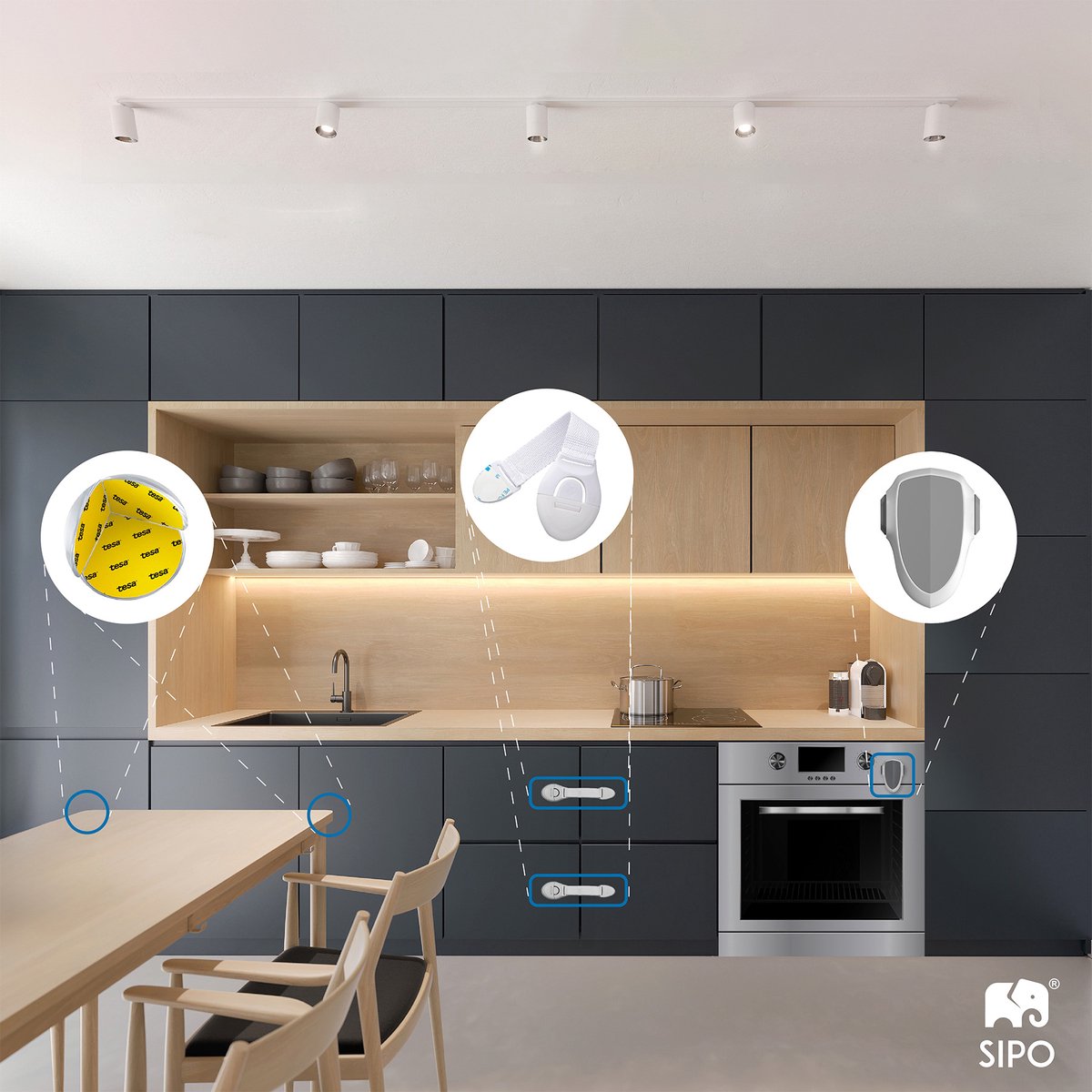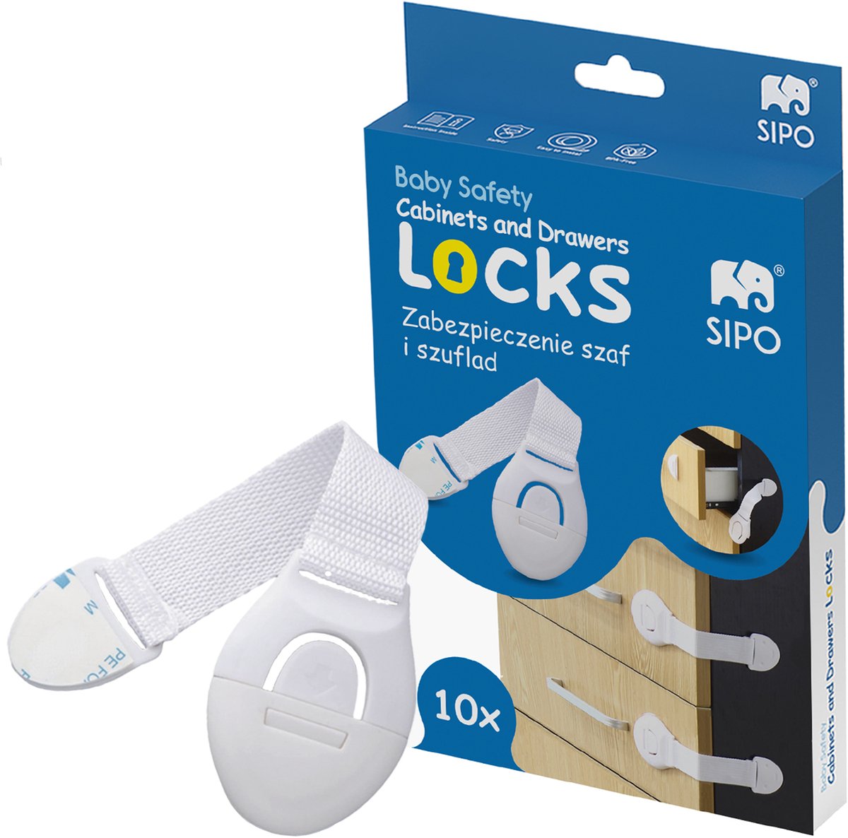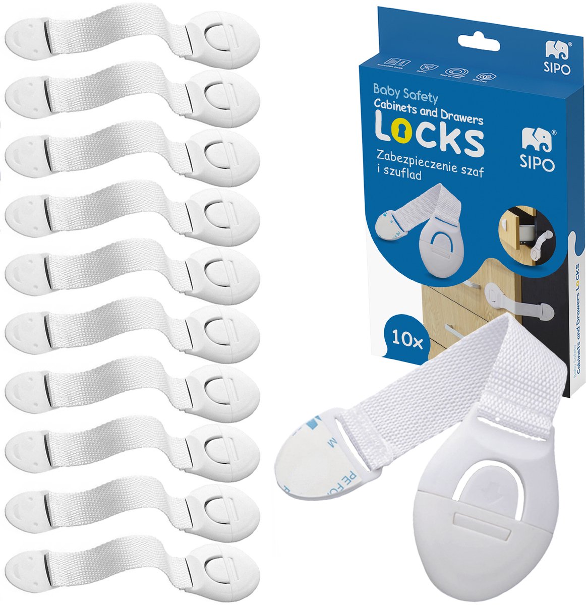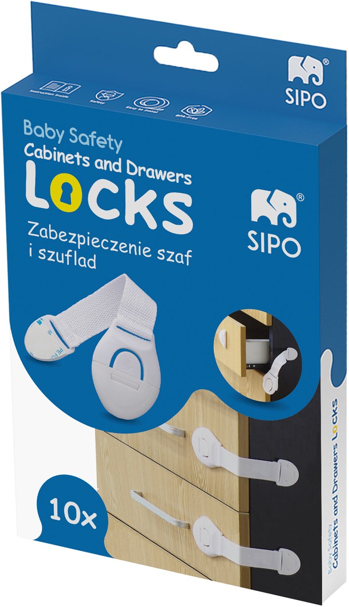 Houd uw kind veilig met de SIPO kast- en laadbeveiliging. Deze 10-delige set met handig kliksysteem voorkomt dat kinderen toegang krijgen tot kasten, lades, koelkasten, ovens en andere meubels. Met eenvoudige installatie op krachtige 3M tape en een flexibele band voor universele toepassing.