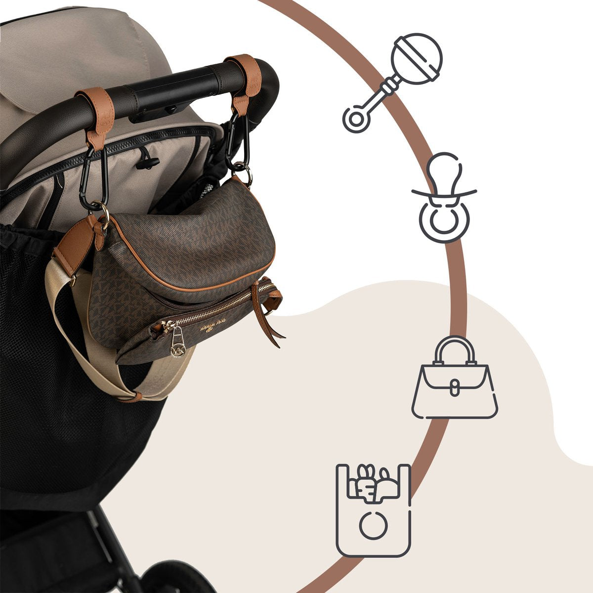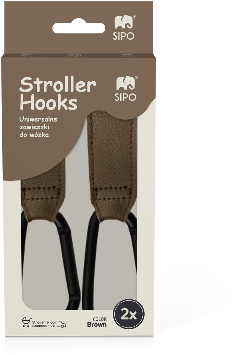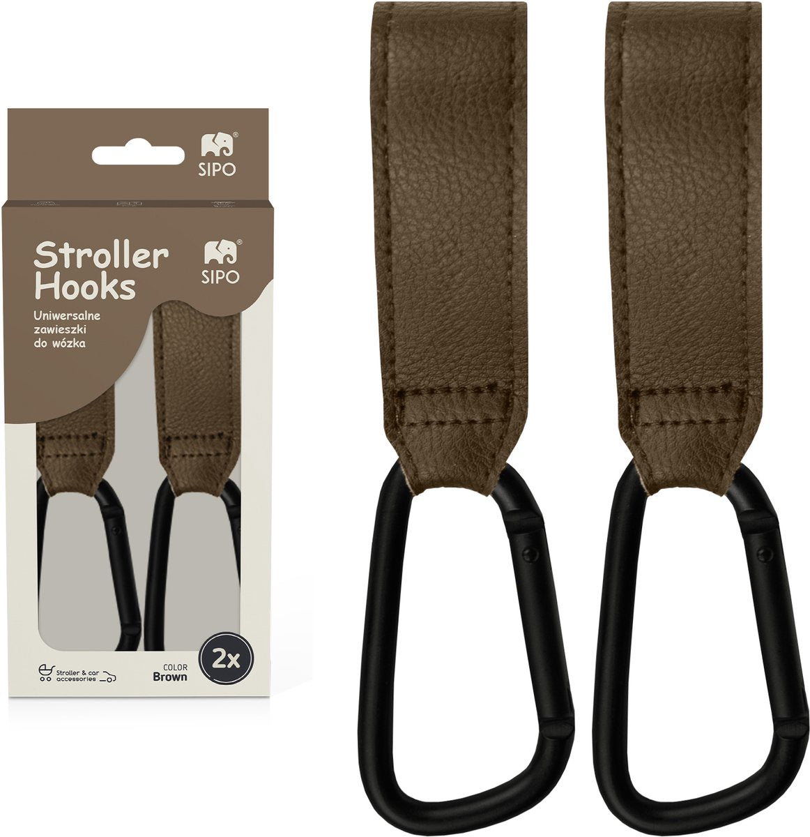 De Sipo SCA-11 haakjes in bruin eco-leer bieden een stijlvolle en praktische oplossing voor het ophangen van essentiële spullen aan kinderwagens en andere vervoermiddelen. Met een draagvermogen van 5 kg per haakje en eenvoudige bevestiging via klittenband.