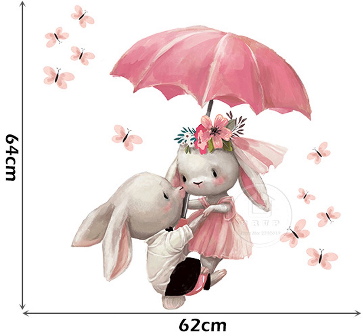 Breng een vleugje tederheid en speelsheid in de kinderkamer met deze betoverende wandsticker van konijntjes met een paraplu. Deze charmante muurdecoratie toont schattige konijntjes onder een kleurrijke paraplu, perfect voor het creëren van een zachte en feeërieke sfeer in elke kinderkamer. Met een formaat van 64x62 cm en extra kleine elementen voor persoonlijke aanpassing.