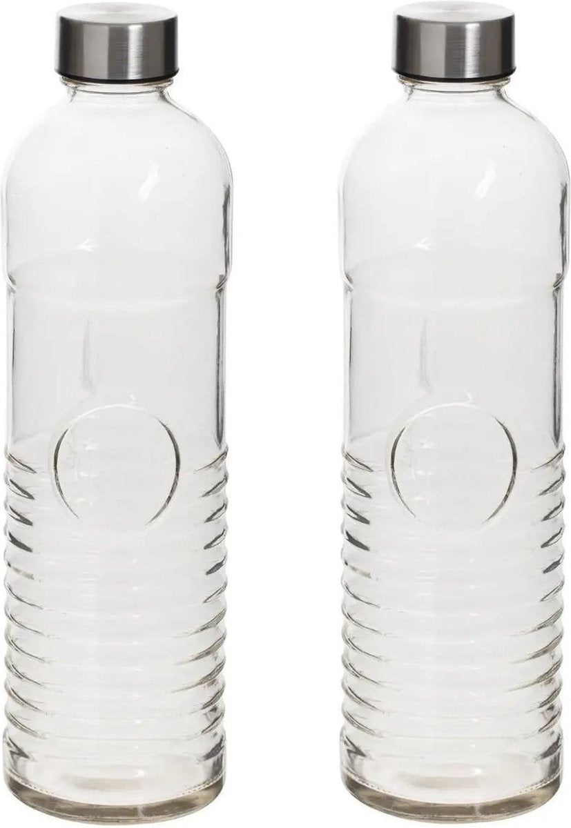 Waterflessen/drinkflessen - 2x - D8 x H29 cm - 1 liter - ribbel glas