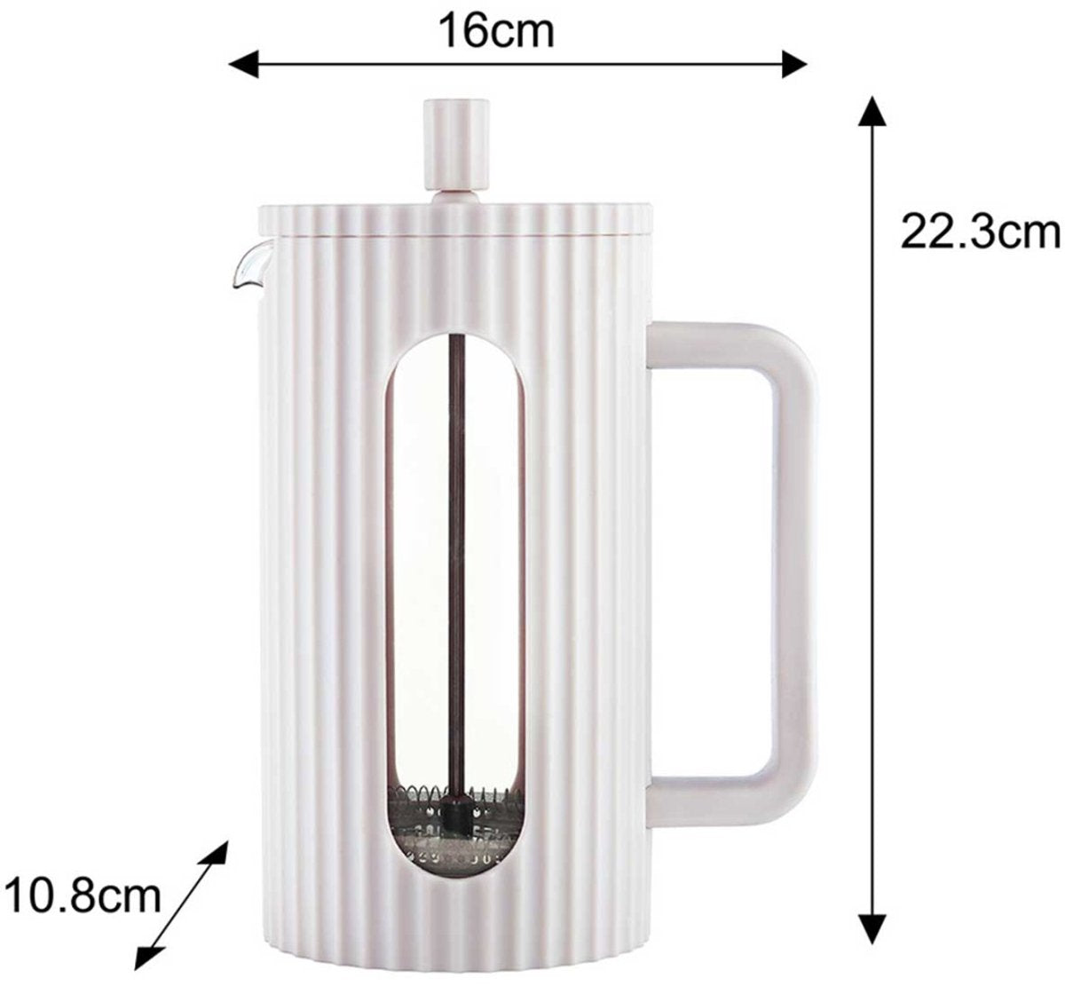 " Een French press is een uiterst praktisch pistonkoffiezetapparaat waarmee u koffie, thee of kruiden kunt zetten. Je kunt een cafetière ook gebruiken om melk op te schuimen. Je giet simpelweg de eerder verwarmde melk in de kan en beweegt de zuiger een aantal keer. De buitenkant is gemaakt van hoogwaardig kunststof met een gegolfd oppervlak, wat de temperatuur van de gezette drank extra isoleert. Een uniek ontwerp dat veiligheid tijdens gebruik garandeert. De ergonomische handgreep en het doordachte ontwerp zorgen voor comfort en veiligheid tijdens gebruik. Kenmerken: Hoogwaardig filtermateriaal van roestvrij staal en borosilicaatglas Uniek ontwerp zorgt voor veiligheid tijdens gebruik Produceert een uitstekend aroma voor gezette dranken, waaronder: koffie, thee, kruiden Een eenvoudige en snelle manier om een warme drank te bereiden door de infusie te scheiden. Vaatwasserbestendig Capaciteit - 1000 ml Afmetingen - Ø10,8 cm x 22,3 cm Kleur: wit